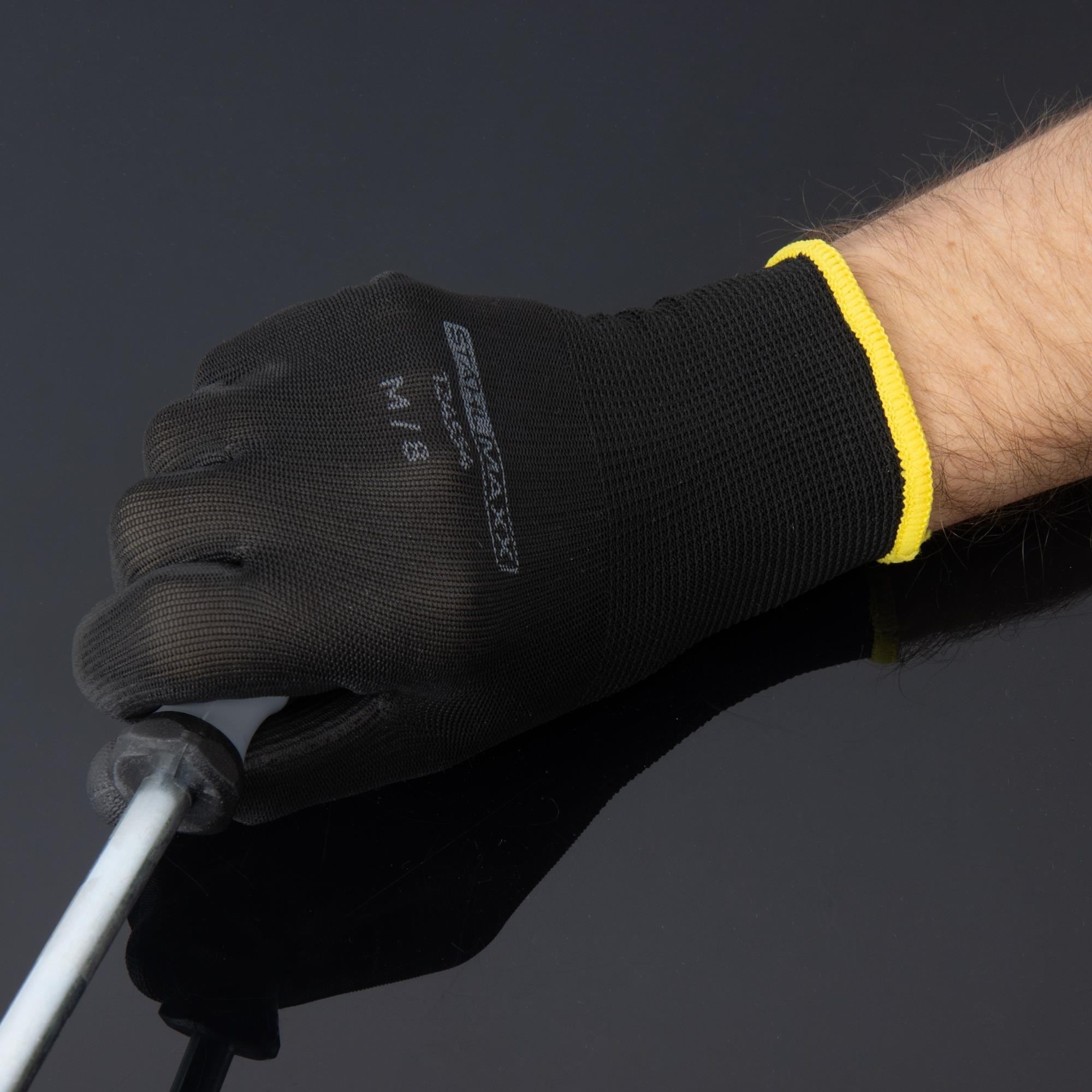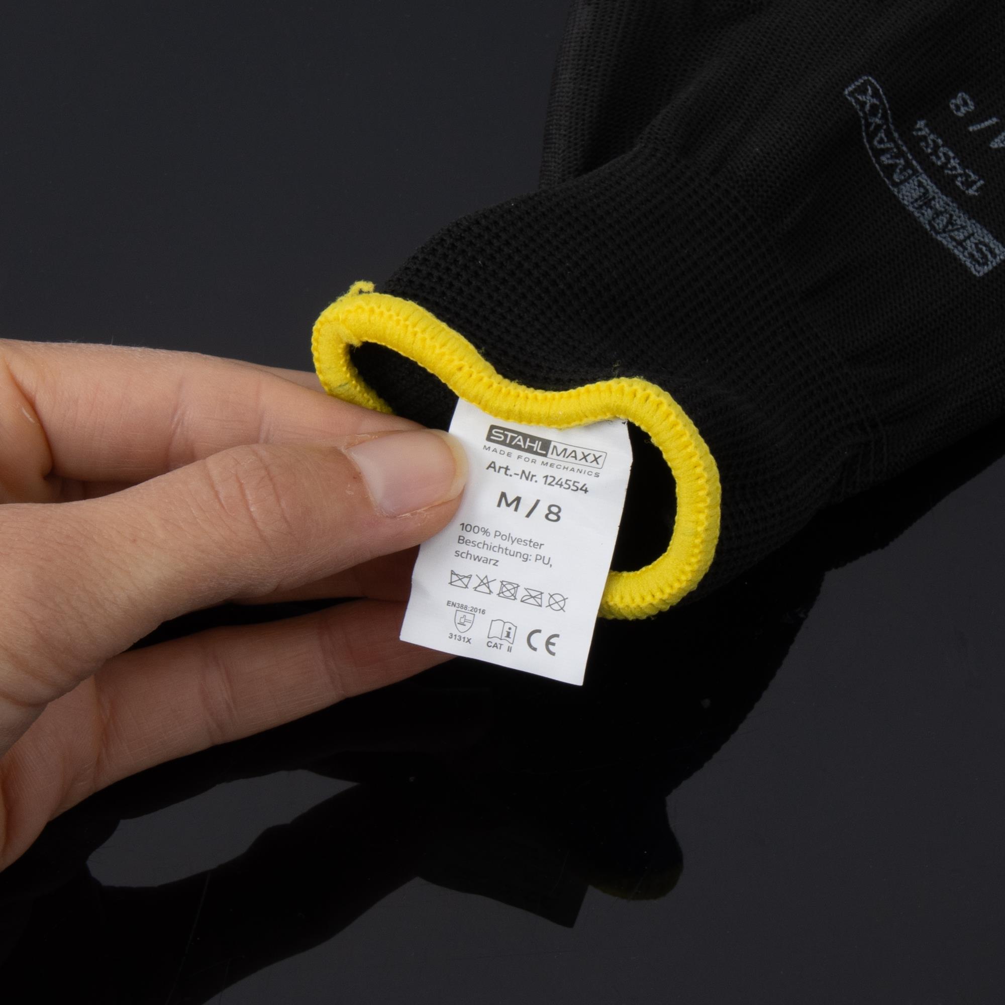 - feuchtigkeitsabweisende, laugen- und ölbeständige Beschichtung aus schwarzem Polyurethan (PU) – bietet ausgezeichneten Schutz vor Hitze, spitzen und scharfen Kanten bei gleichzeitig hoher Feinfühligkeit und verbesserter Griffigkeit