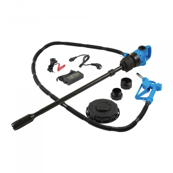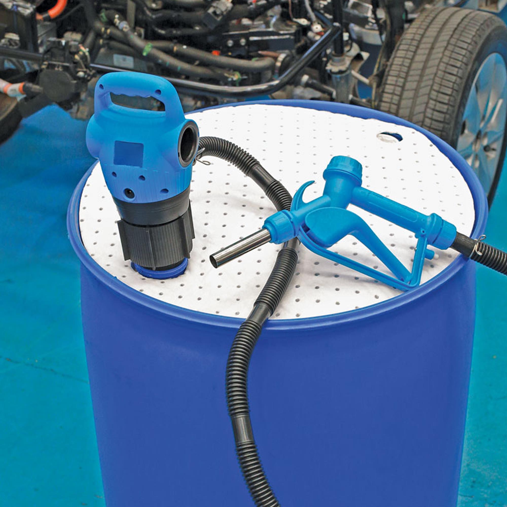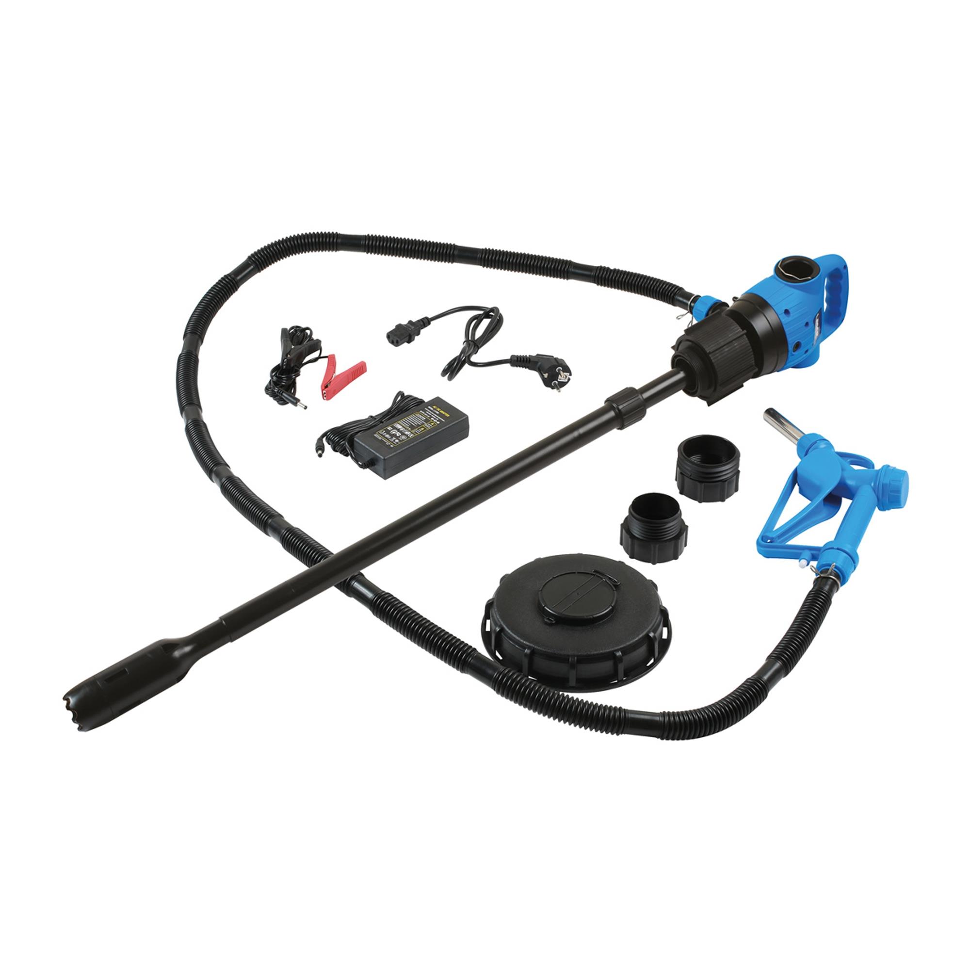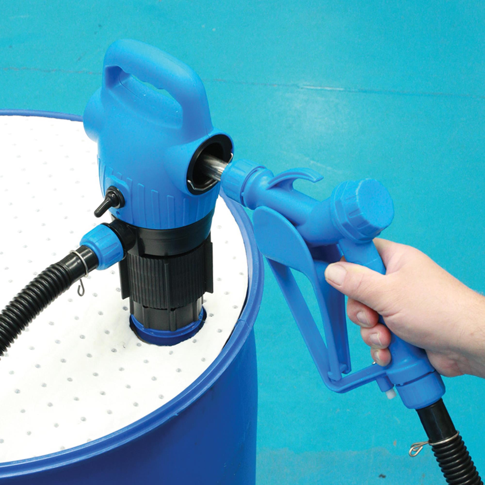 Elektrische Pumpe, passend für 205-l-Fässer (45 Gallonen) und IBC-Tanks, bei denen die Zugangsöffnung einen Durchmesser von mehr als 55 mm hat. Betrieb mit 230V AC oder 12V DC.
