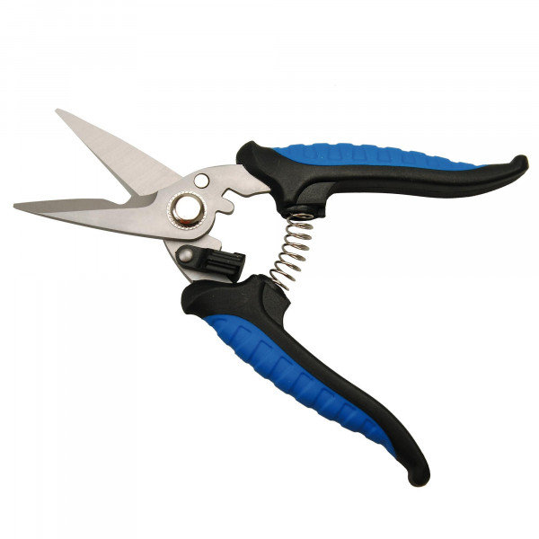 Universalschere aus Edelstahl mit 2-Komponenten-Griffe in ergonomischer Form. Mit Feder und Sicherheitsverschluss. Eine Schneide mit feiner Sägezahnung. Mit Abisolier-Aussparung.
