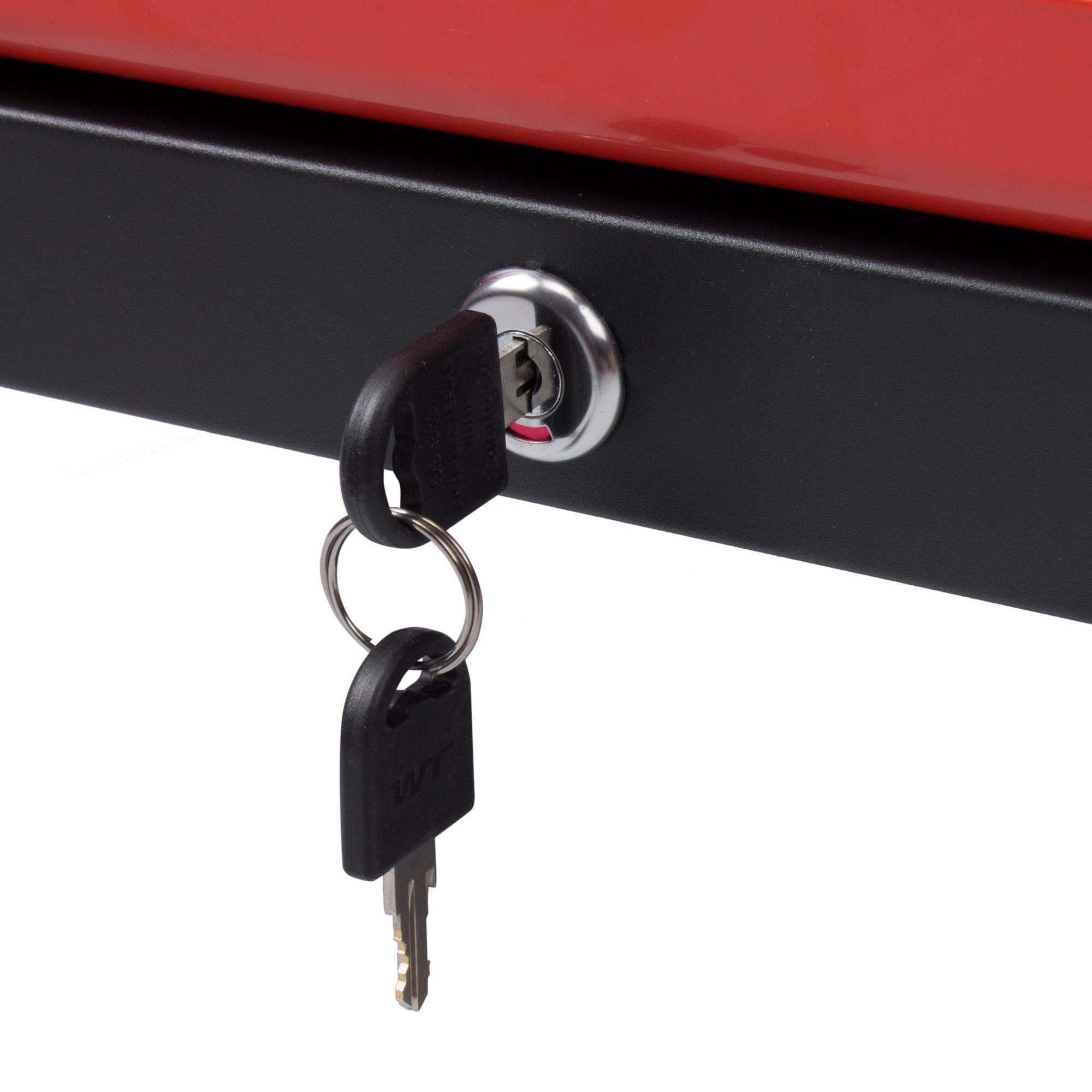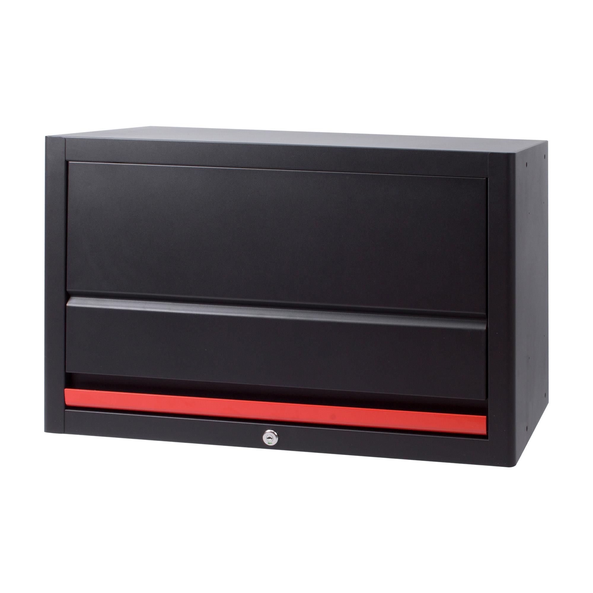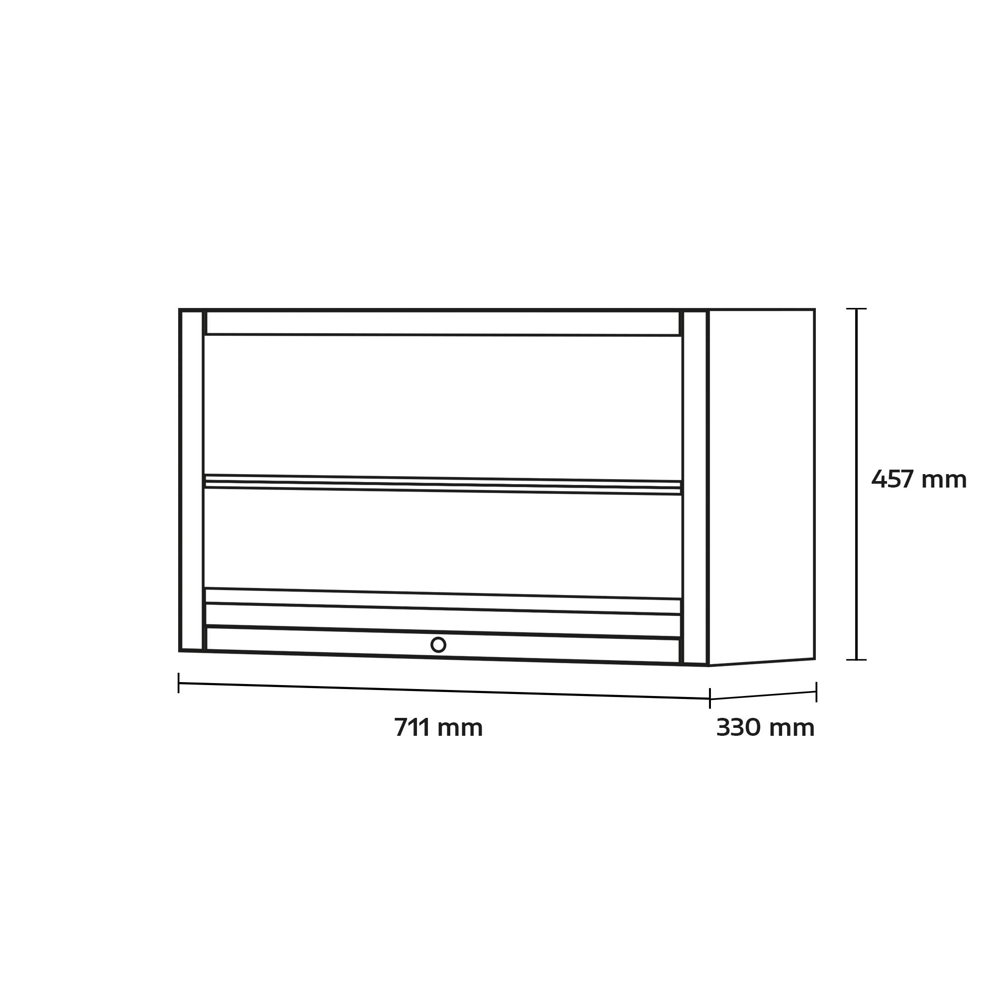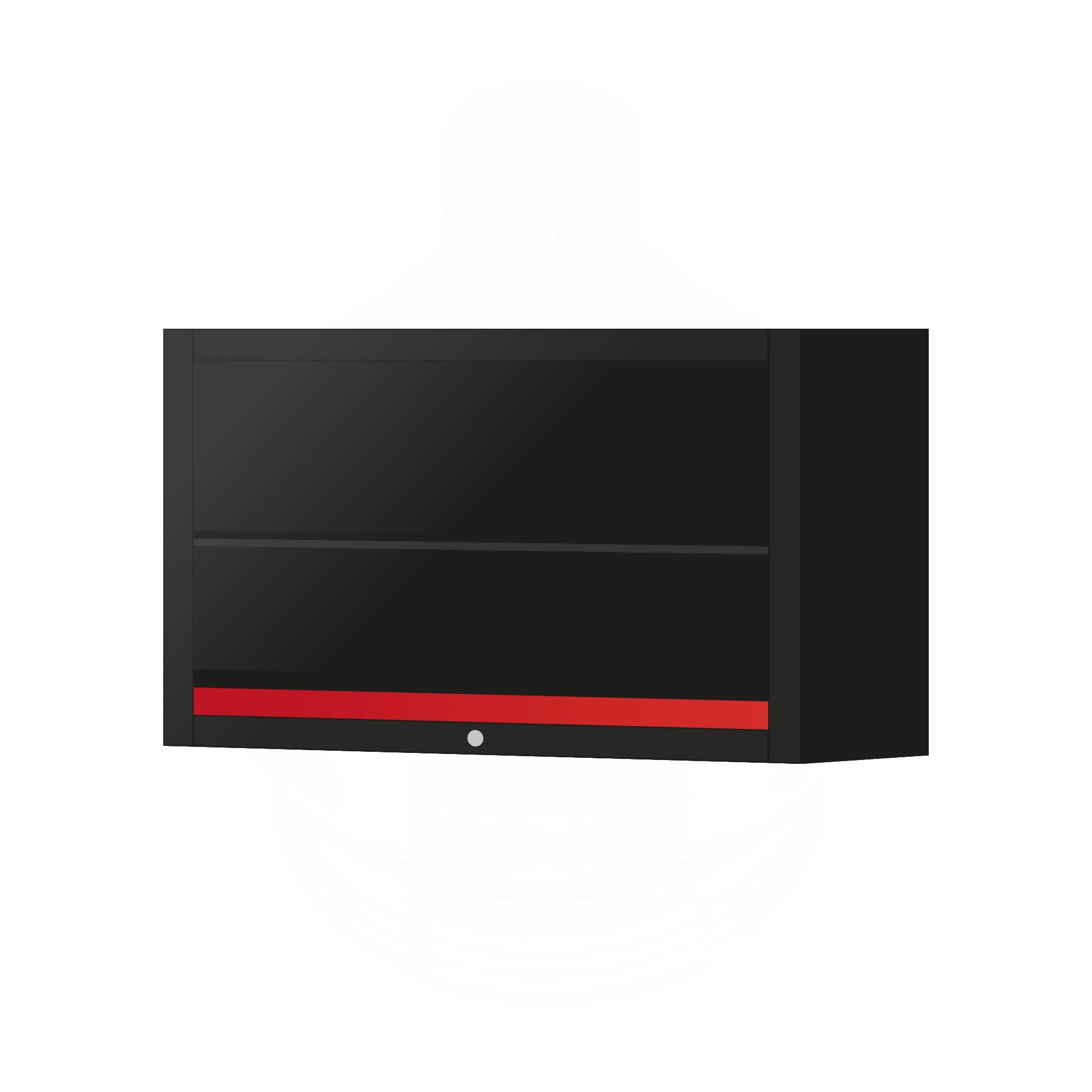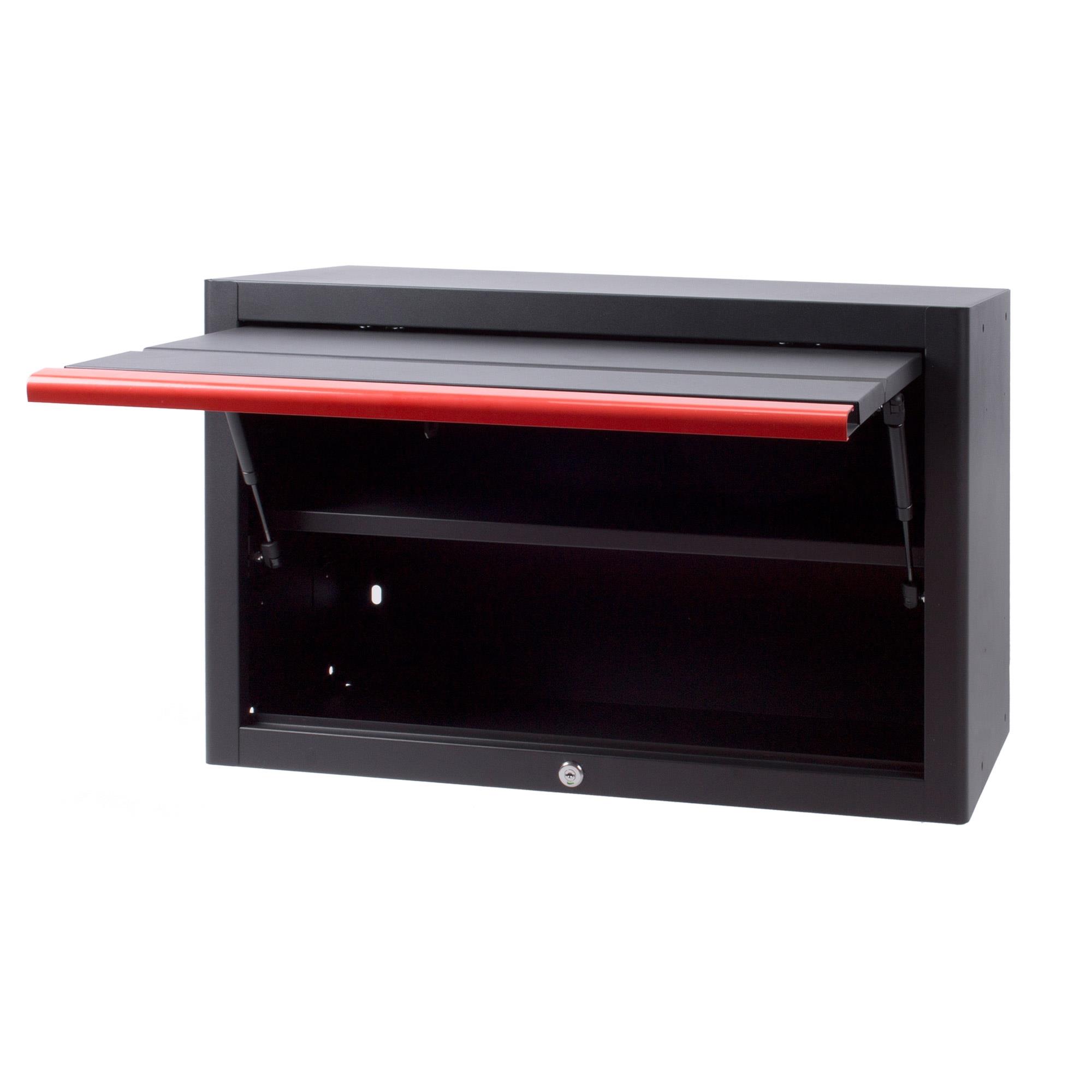 Dieser Hängeschrank aus Metall eignet sich besonders zum Verstauen von Werkzeugen, die nicht im täglichen Gebrauch sind. Der Hängeschrank lässt sich mithilfe von Gasdruckfedern einfach und lautlos auf- und zumachen. Dank des Dämpfungsmechanismus ist ein sanftes Schließen der Schrankklappe garantiert. Zusätzliche Sicken in der Klappe geben ihr optimale Stabilität. Edelstahlscharniere verhindern ein leichtes Ausbrechen der Schrankklappe. Der Hängeschrank ist aus 0,8 mm kaltgewalztem Stahl gefertigt und liefert somit eine gleichbleibende und zuverlässige Qualität. Einen zusätzlichen Schutz bietet die Pulverbeschichtung. Das matte Finish und schlichte Design tragen zu einer zeitlosen Werkstatteinrichtung bei. Der Hängeschrank wird inklusive einem Fachboden geliefert, welcher für eine maximale Belastung von 15 kg ausgelegt ist. Der Metallschrank ist abschließbar. Er ist auch in Kombination mit weiteren Schränken der Werkstattserie als platzsparender und gut sortierter Aufbewahrungsort für Ihr Werkzeug zu nutzen.