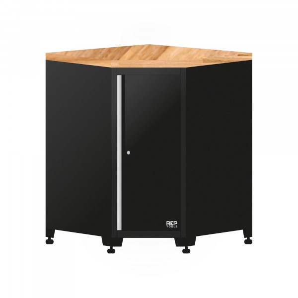 Geräumiger Unterschrank. Dieser Eck-Unterschrank aus Metall eignet sich besonders gut, um große Gegenstände zu verstauen. Der Unterschrank wird mit einer 38 mm starken Arbeitsplatte aus Hevea-Holz (Gummibaum) geliefert. Die Arbeitsplatte ist besonders robust und stabil. Der Härtegrad von Hevea-Holz liegt bei 6,2 Brinell-Härte (zum Vergleich: Eichenholz: 4,3 Brinell-Härte). Der Schrank wird mit einem Fachboden geliefert, der mit maximal 20 Kilo belastet werden kann. Zwei Edelstahlscharniere verhindern ein leichtes Ausbrechen der Schranktüren. Der Metallunterschrank dient sowohl als Einzelschrank, als auch in Kombination mit weiteren Schränken der Werkstattserie als platzsparender und gut sortierter Aufbewahrungsort für Ihr Werkzeug. Der 0,8 mm kaltgewalzte Stahl liefert eine gleichbleibende und zuverlässige Qualität. Die Pulverbeschichtung bietet einen zusätzlichen Schutz. Das matte Finish und schlichte Design tragen zu einer zeitlosen Werkstatteinrichtung bei. Der Metallschrank ist abschließbar und wird mit zwei Schlüsseln geliefert. Die höhenverstellbaren Füße ermöglichen ein Feinjustieren auch bei unebenem Untergrund.