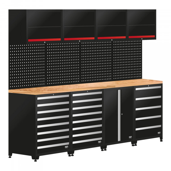 4 Unterschränke bilden die Basis dieser 4-Module-Schrankkombination. Drei Schubladenschränke und ein 2-türiger Unterschrank bieten auch in einer kleinen Werkstatt viel Stauraum. Jede Schublade hat eine maximale Tragkraft von 40 Kilo. Problemlos können Akkubohrmaschine, Drehmomentwerkzeug, Multimeter etc. verstaut werden. Die Schubladen sind durch ein Sicherungssystem gesichert und können somit auch bei ganzem Auszug nicht herausfallen.