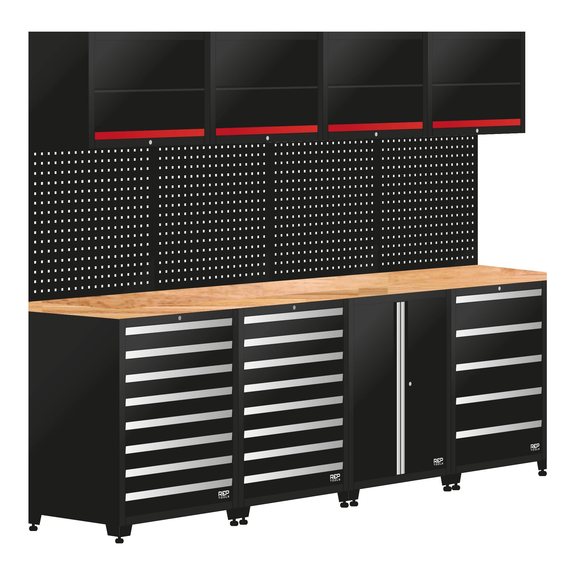 Die Werkstattwand wird durch 4 Hängeschränke komplettiert. Die Hängeschränke lassen sich mithilfe von Gasdruckfedern einfach und lautlos auf- und zumachen. Dank des Dämpfungsmechanismus ist ein sanftes Schließen der Schrankklappen garantiert. Zusätzliche Sicken in den Klappen geben optimale Stabilität. Edelstahlscharniere verhindern ein leichtes Ausbrechen der Schrankklappen. Die Hängeschränke werden inklusive je einem Fachboden geliefert, der für eine maximale Belastung von 15 kg ausgelegt ist.