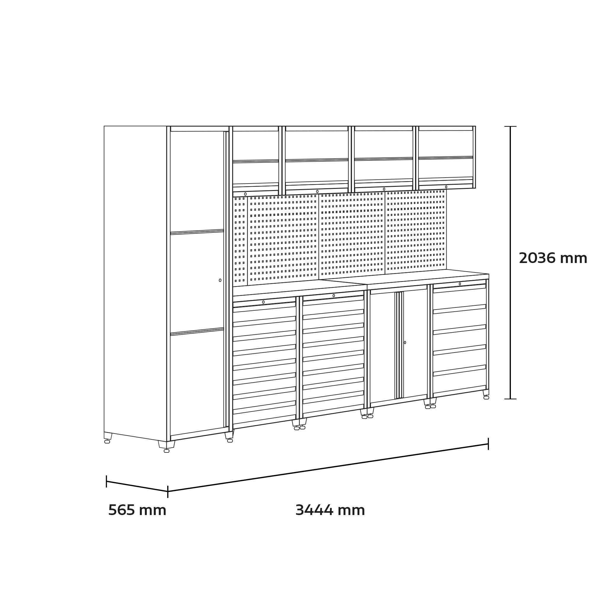 Die Werkstattwand wird durch vier Hängeschränke komplettiert. Diese lassen sich mithilfe von Gasdruckfedern einfach und lautlos auf- und zumachen. Dank des Dämpfungsmechanismus ist ein sanftes Schließen der Schrankklappen garantiert. Zusätzliche Sicken in den Klappen geben optimale Stabilität. Edelstahlscharniere verhindern ein leichtes Ausbrechen der Schrankklappen. Die Hängeschränke werden inklusive je einem Fachboden geliefert, der für eine maximale Belastung von 15 kg ausgelegt ist.
