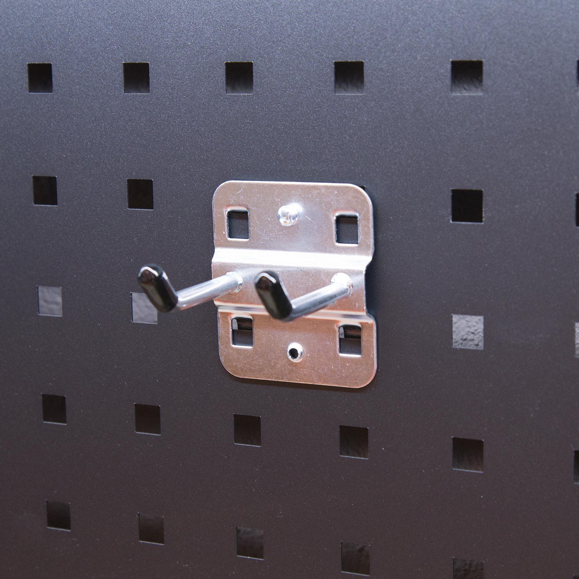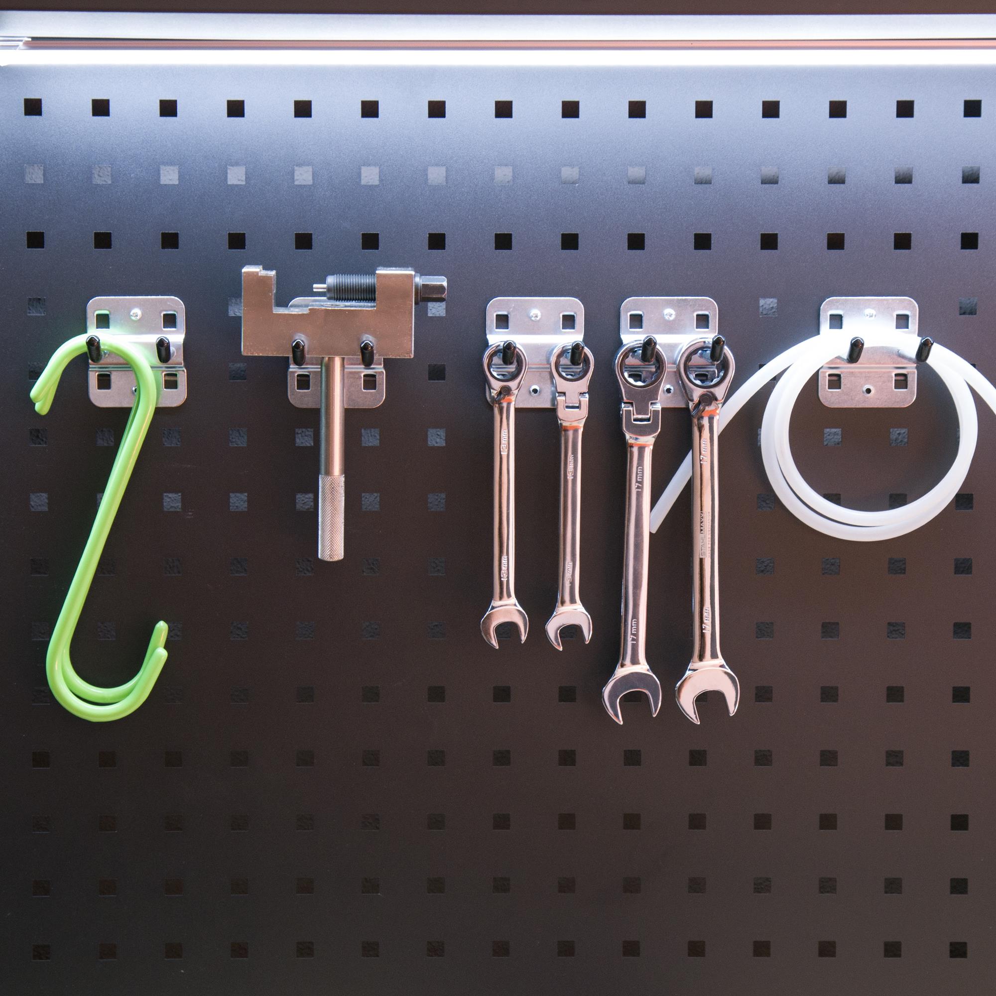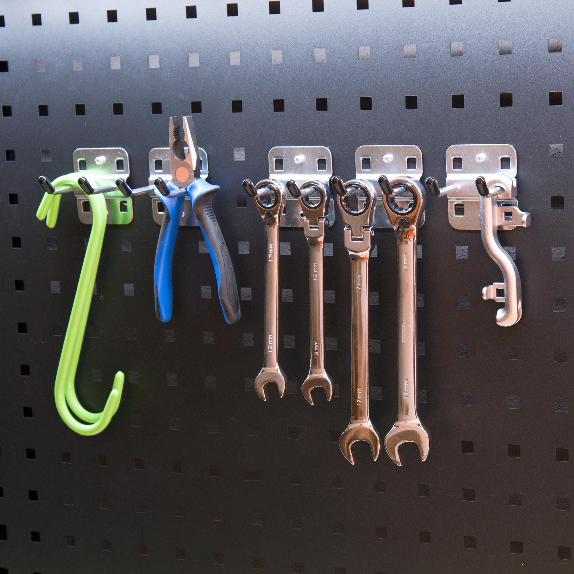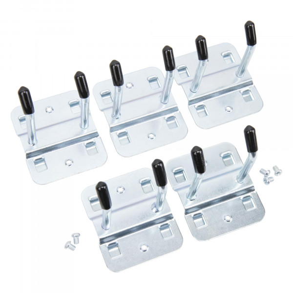 Praktisches Set aus 5 Doppelhaken zum Einhängen in Lochwände, Werkstattwagen, usw., zum organisierten Aufhängen von Werkzeug und Zubehör.