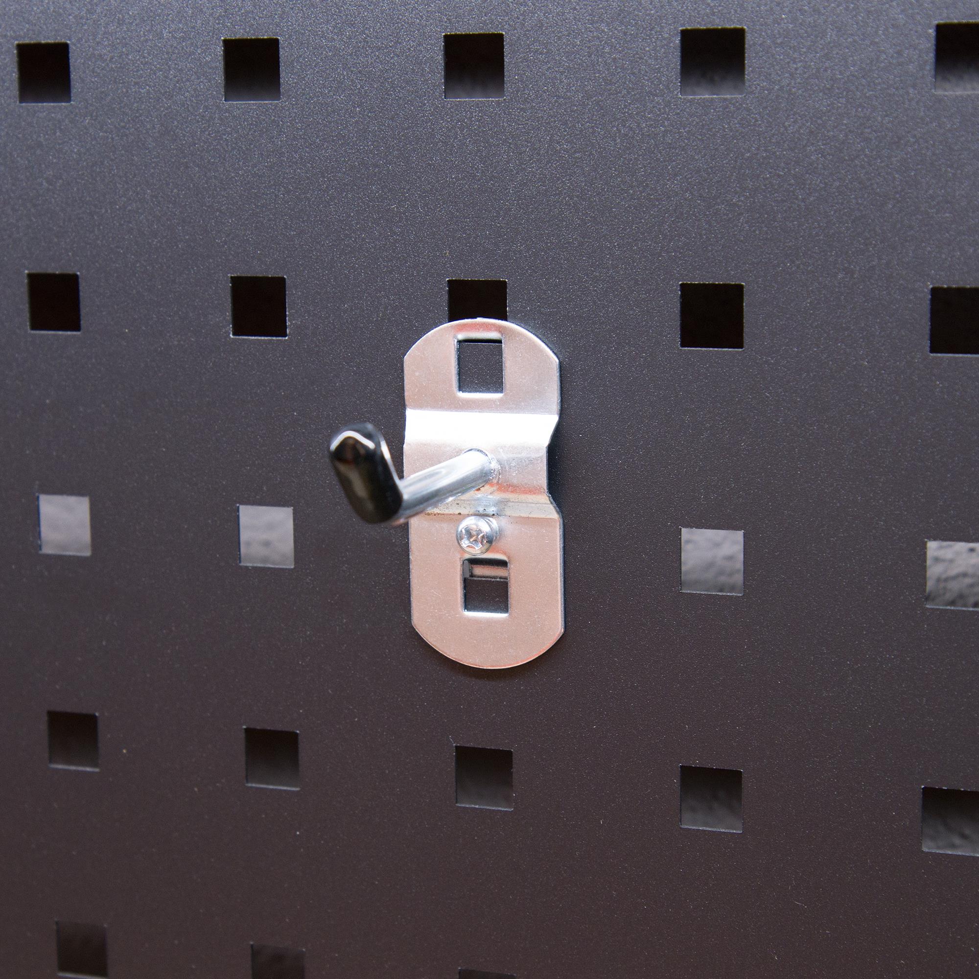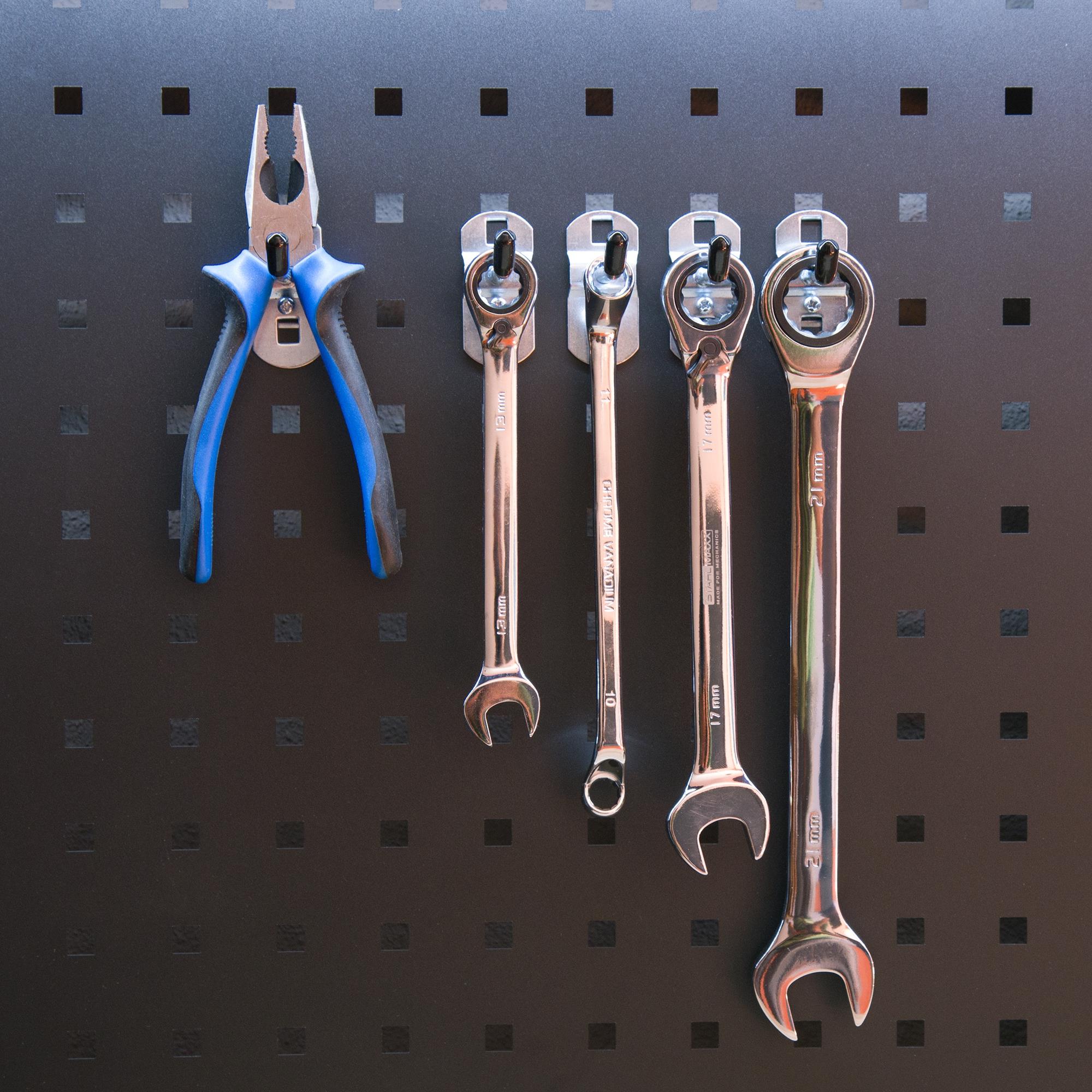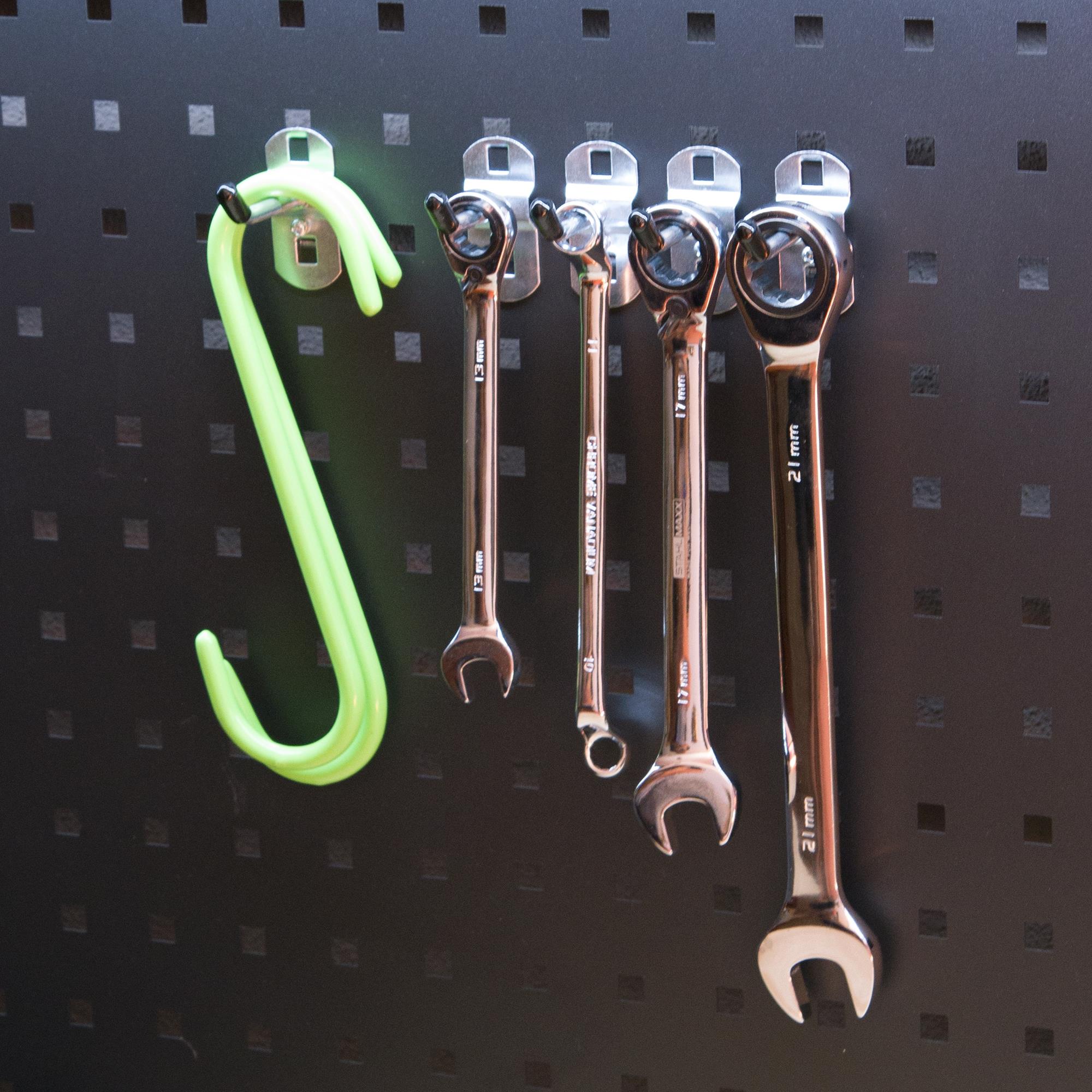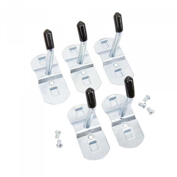 Mit diesem praktischen Set aus 5 Einzelhaken zum Einhängen in Lochwände, Werkstattwagen, usw., bleibt deine Werkstatt top organisiert. Die Haken eignen sich zum Aufhängen von verschiedenem Werkzeug und Zubehör und passen perfekt für Lochwände mit 10 x 10 mm Vierkant-Lochung und 38 mm Lochabstand.