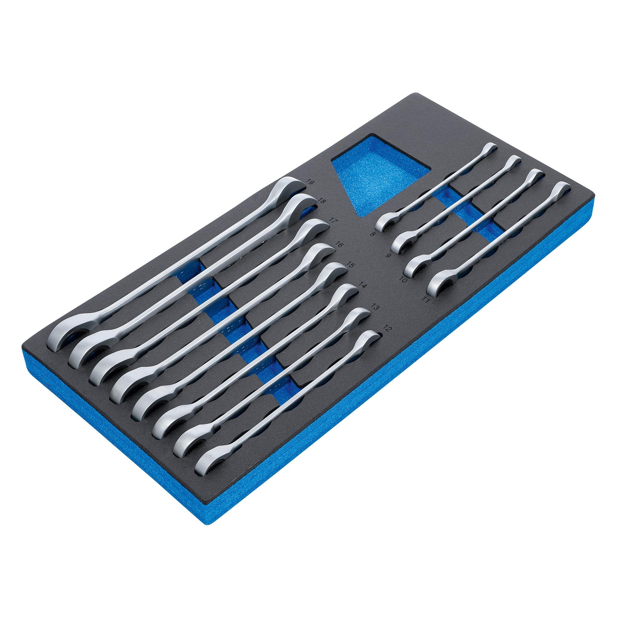 12-teiliger Ratschenring-Maulschlüssel-Satz in praktischer Schaumstoffeinlage.