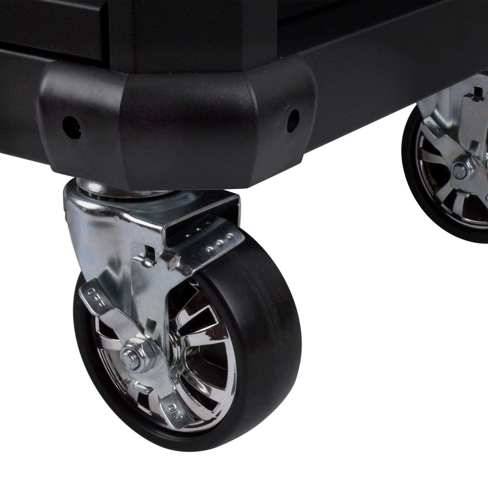 Dieser Werkstattwagen bietet mit seinen sieben Schubfächern (5 flache, 2 hohe) viel Platz für Ihr Werkzeug. Jede Schublade hat eine maximale Tragkraft von 40 Kilo und wird mit jeweils einer EVA-Einlegematte geliefert um Ihr Werkzeug sicher aufzubewahren. Der Werkstattwagen aus kaltgewalztem Stahl ist von gleichbleibender und zuverlässiger Qualität, besonders robust und durch die doppelwandige Bauweise mit Eckstoßfängern aus massivem Kunststoff sehr langlebig. Die kratzfeste und hochwertige Pulverbeschichtung bietet einen zusätzlichen Oberflächenschutz. Die große, gerillte Kunststoffarbeitsplatte sorgt mit ihren 6 Kleinteilfächern für ein aufgeräumtes Arbeiten. Dank der gelochten Seitenwänden können Sie Ihr Werkzeug dort stets griffbereit organisieren. Der Werkstattwagen ist abschließbar und wird mit zwei Schlüsseln geliefert. Durch seine vier großen Kunststoffrollen – zwei davon feststellbar – ist er am Arbeitsbereich flexibel einsetzbar und bietet eine hohe Standfestigkeit.