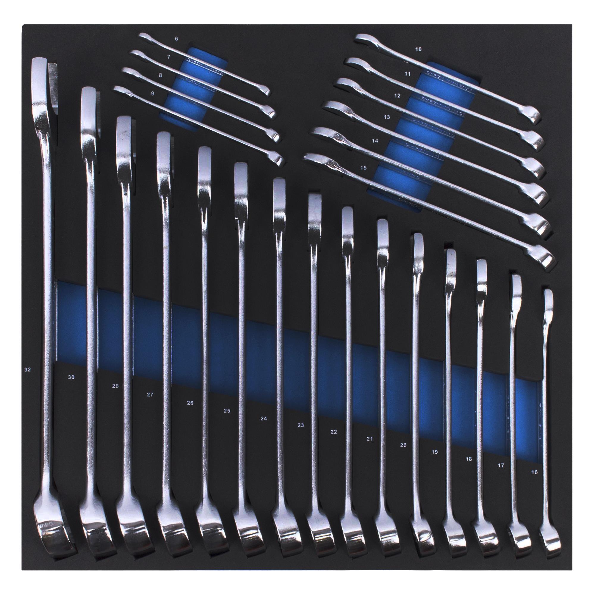• 25 Gabel-/Ringschlüssel: 6, 7, 8, 9, 10, 11, 12, 13, 14, 15, 16, 17, 18, 19, 20, 21, 22, 23, 24, 25, 26, 27, 28, 30, 32 mm