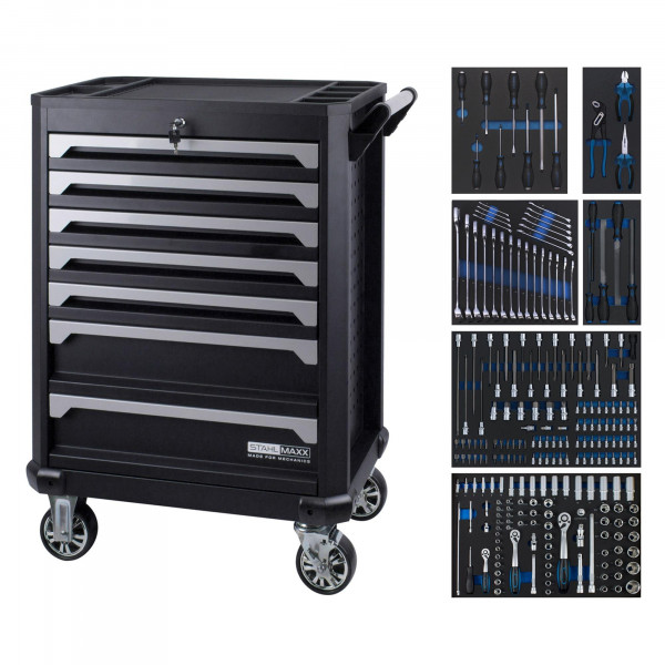 "Werkstattwagen, 300 kg Gesamtbelastbarkeit, 40 kg pro Schubfach, mit 219 Werkzeugen"