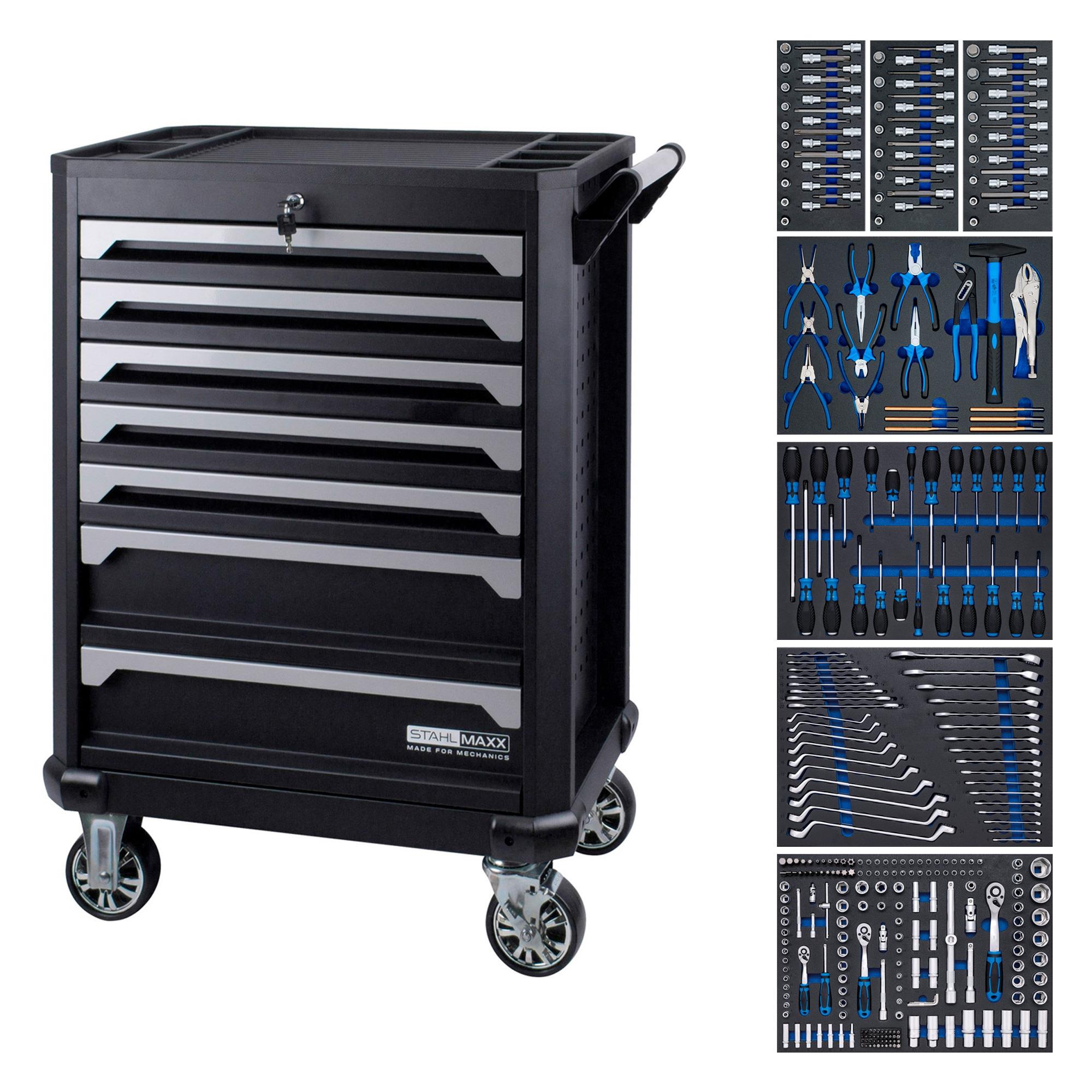 Dieser Werkstattwagen bietet mit seinen sieben Schubfächern (5 flache, 2 hohe) viel Platz für Werkzeuge und kommt bereits mit 7 voll bestückten Schaumstoffeinlagen. Mit diesem All-in-One-Werkstattwagen bekommen Sie alle nötigen Werkzeuge um sofort mit dem Arbeiten loselegen zu können.