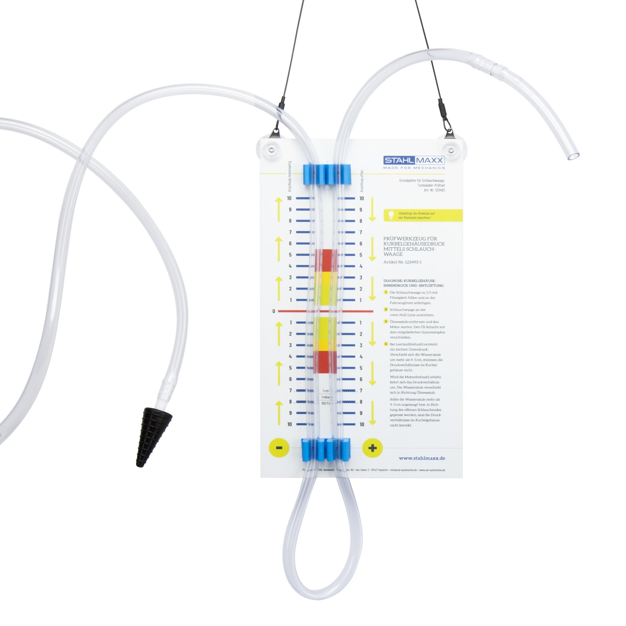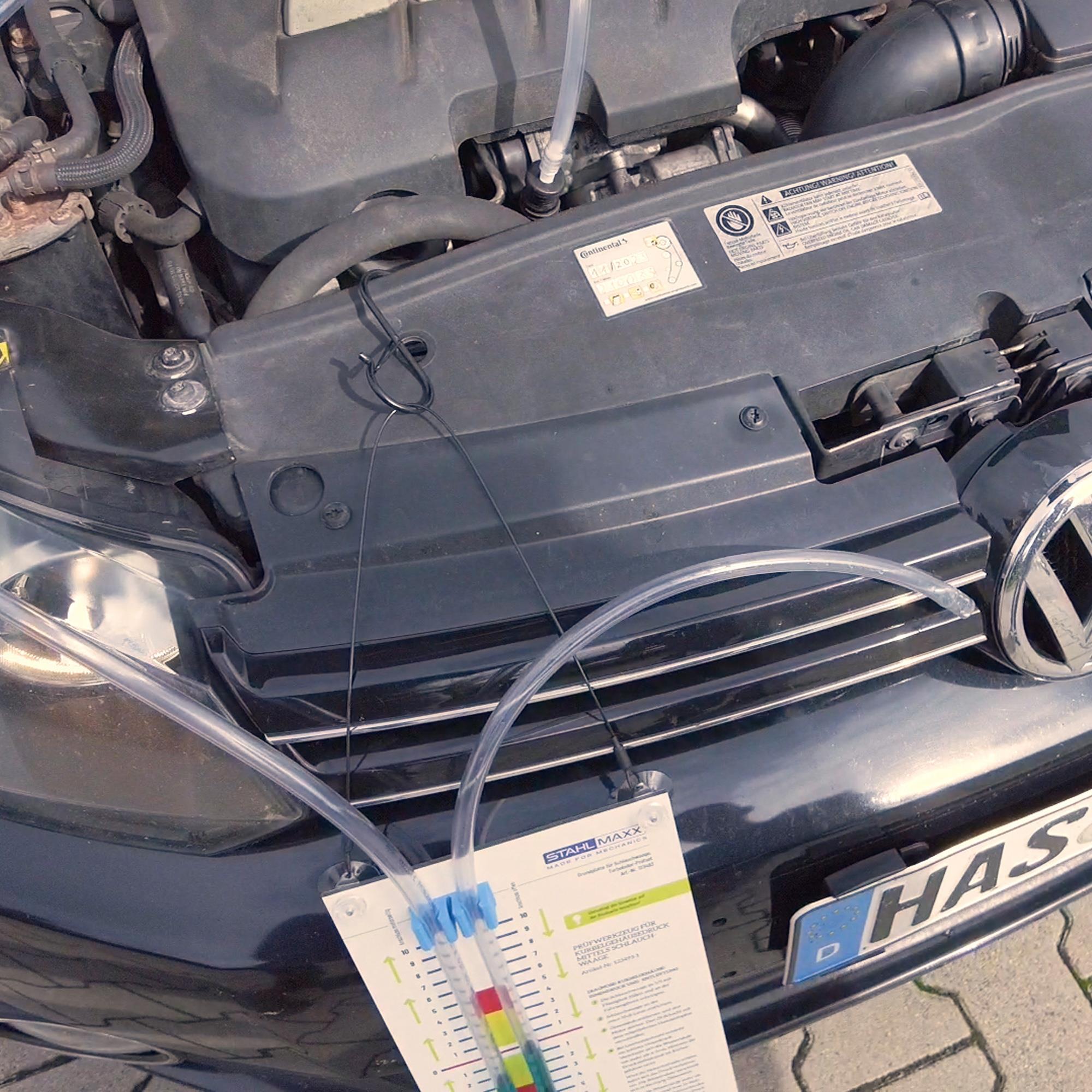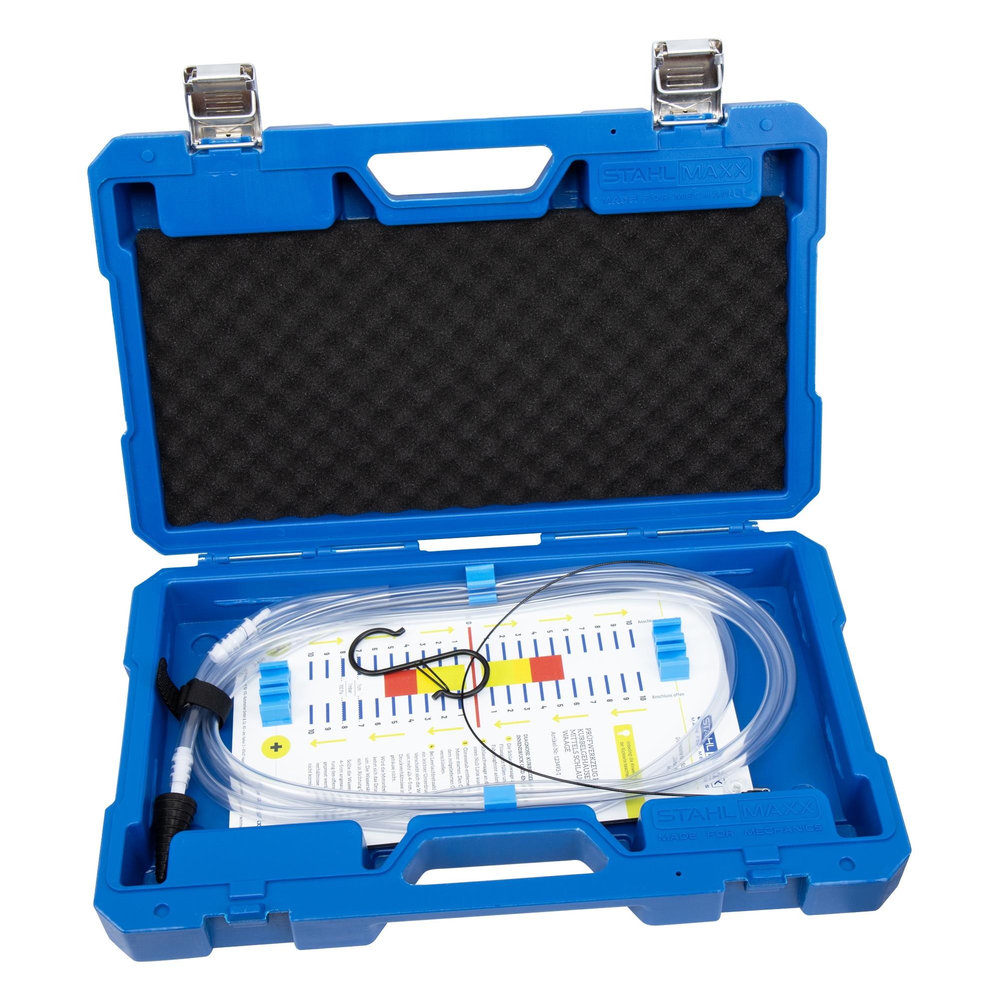 Hochwertiges, professionelles Diagnose-Werkzeugset von STAHLMAXX, zur Kontrolle und Prüfung der Funktion und Zustandskontrolle der Kurbelgehäuseentlüftung, mittels Schlauchwaage.