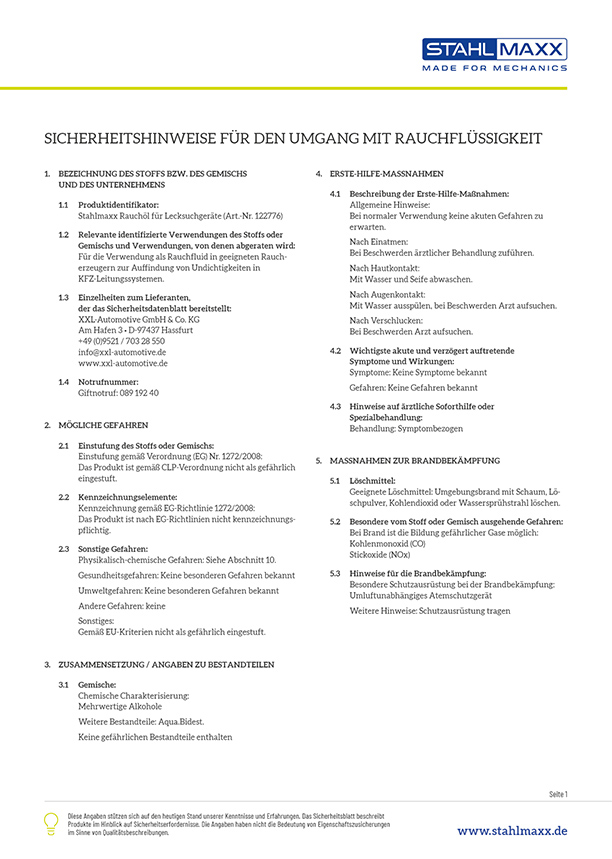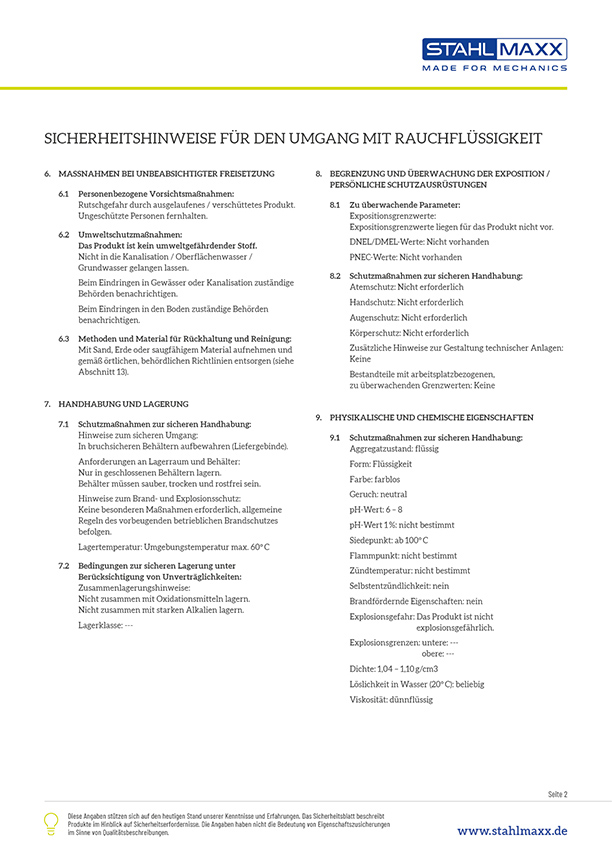Spezielles, gebrauchsfertiges Nebelfluid für Rauchgasgeräte, zur schnellen Diagnose und Ortung von Undichtigkeiten – geeignet für die Rauchgeräte Art.-Nr. 120468 und 120469. Dieses Rauchmittel ist toxikologisch unbedenklich und biologisch abbaubar. Die spezielle Zusammensetzung erzeugt einen sehr dichten und langanhaltenden Nebel, der durch eine Lichtquelle optisch noch verstärkt werden kann.