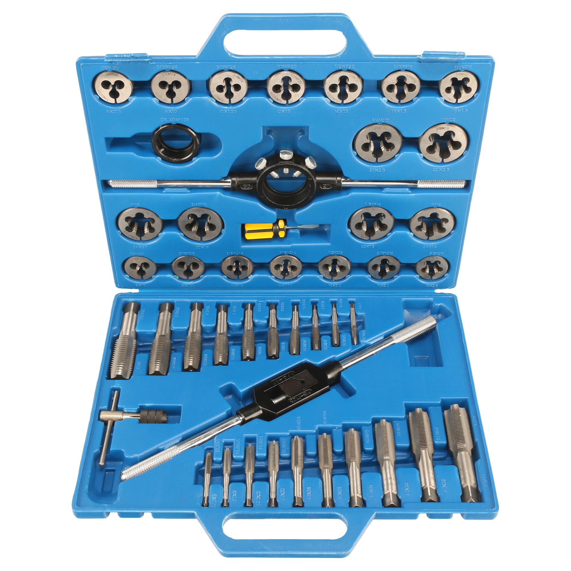 Dieses 45-teilige Set enthält Schneideisen und Gewindebohrer aus Wolframstahl für Innen- und Außengewinde in Zollgrößen in Normal- und Feingewinde, sowie Schneideisenhalter, Windeisen und weiteres Zubehör.