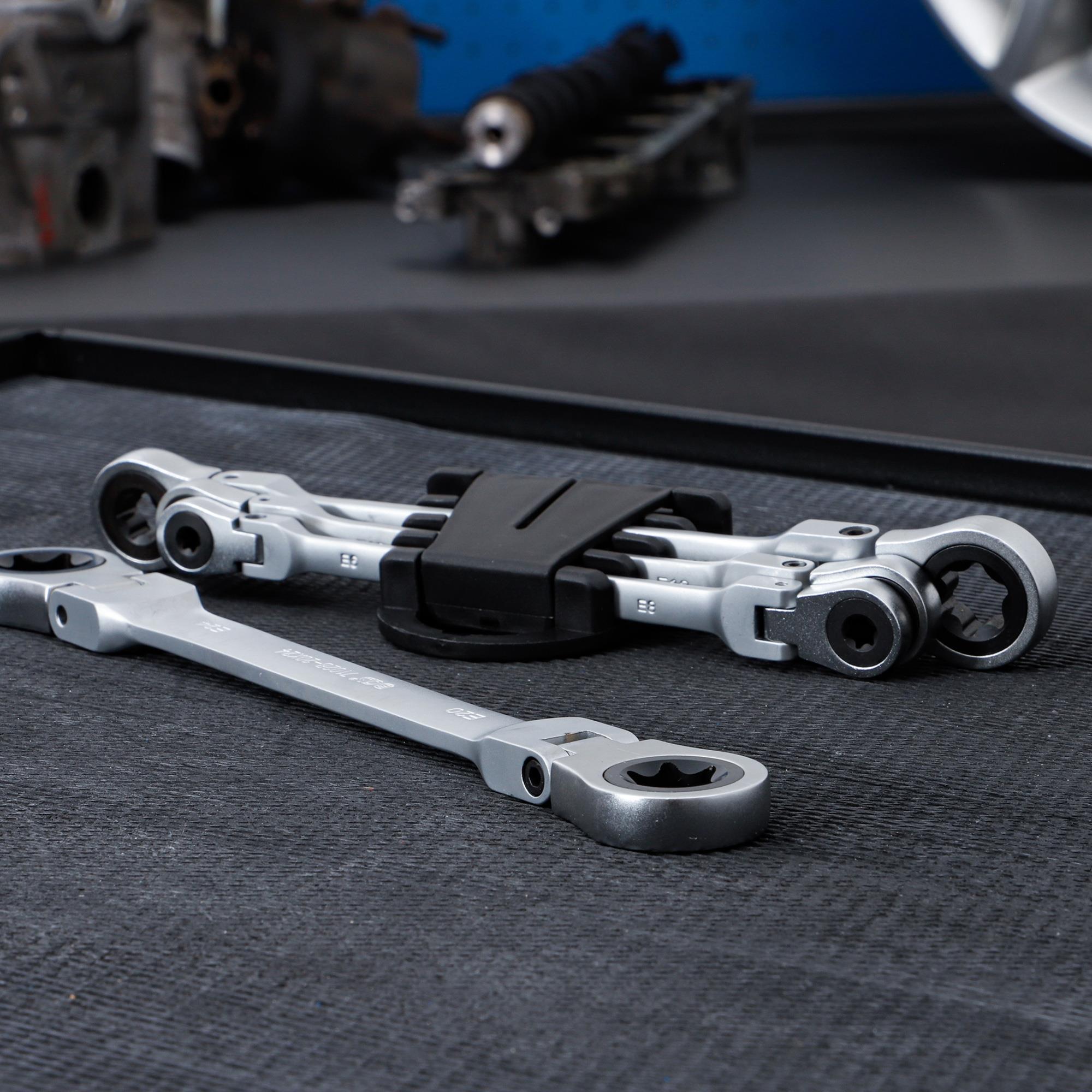 Weiterführende Links zu "Doppel-Ratschen-Ringschlüssel-Satz, abwinkelbar, mit E-Profil Ringköpfen, SW E6 - E24, 4-tlg"
