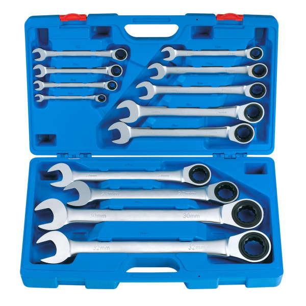 Hochwertiges Ratschen-Ring-Maulschlüssel Sortiment, bestehend aus 13 gesenkgeschmiedeten Einzelgrößen von 8 bis 32 mm.