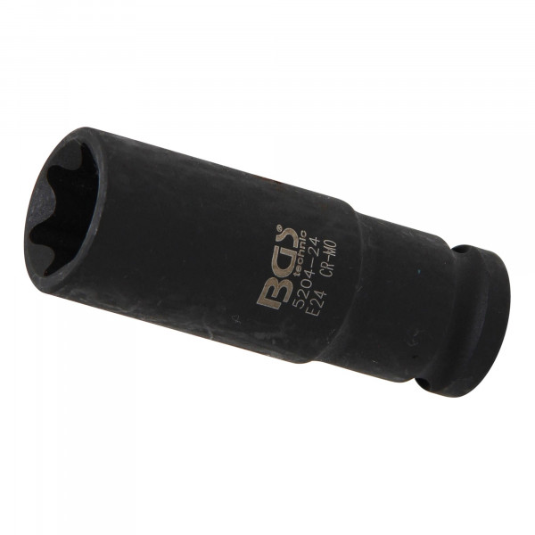 Gehärteter Steckschlüssel (Stecknuss), in langer Ausführung mit E-Profil E24, Schlagschrauber geeignet.