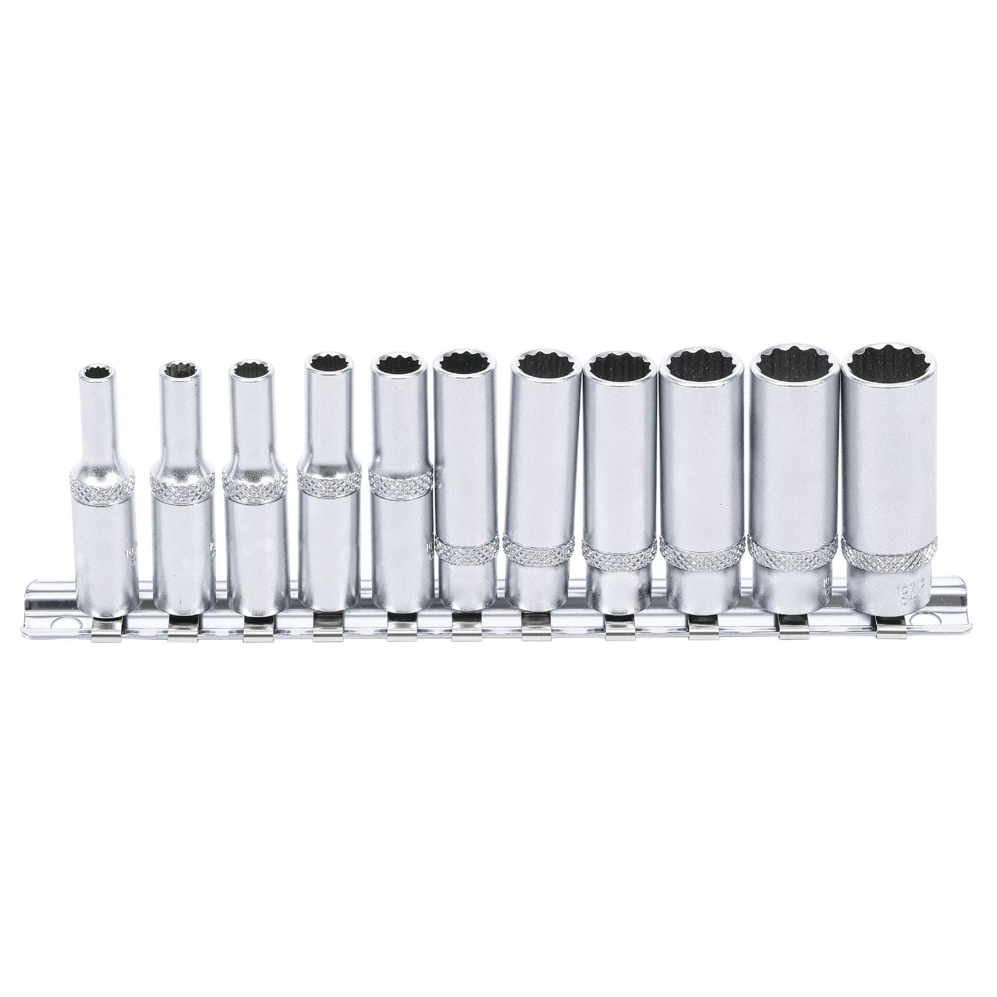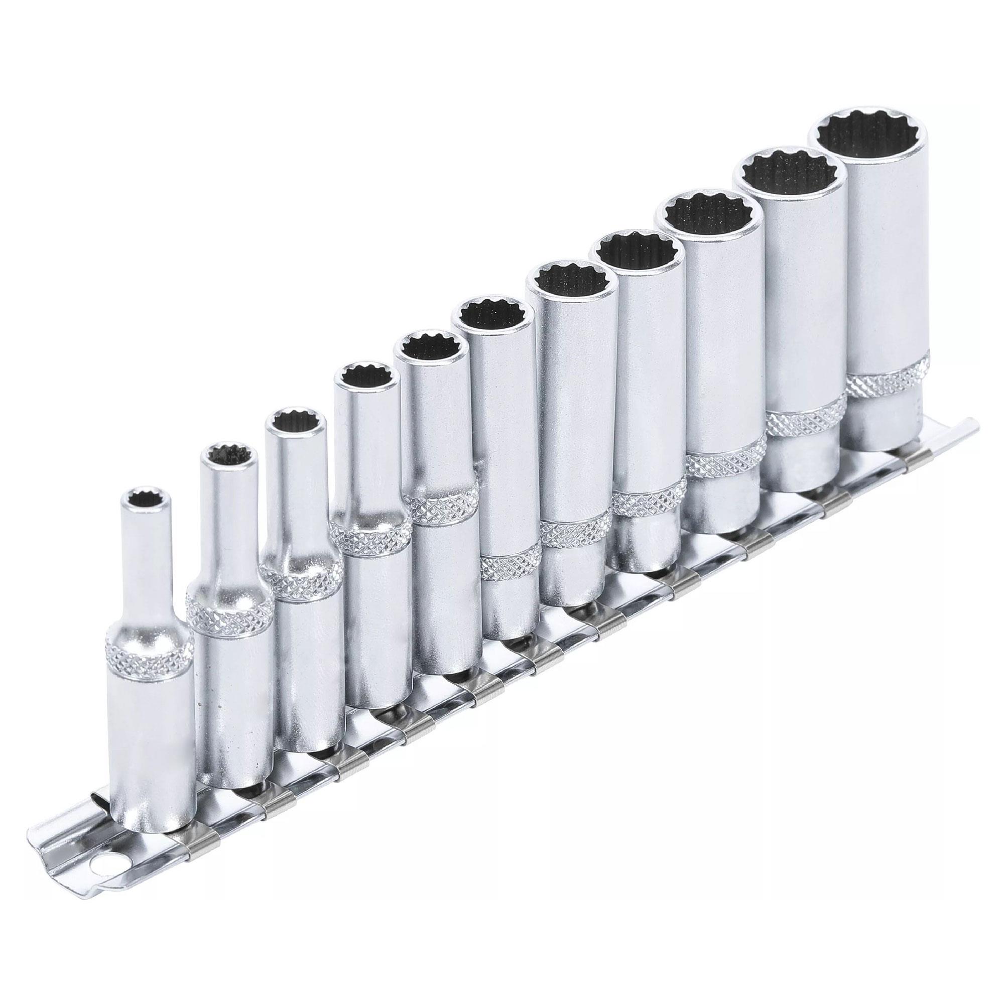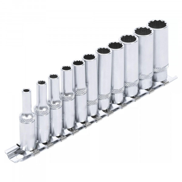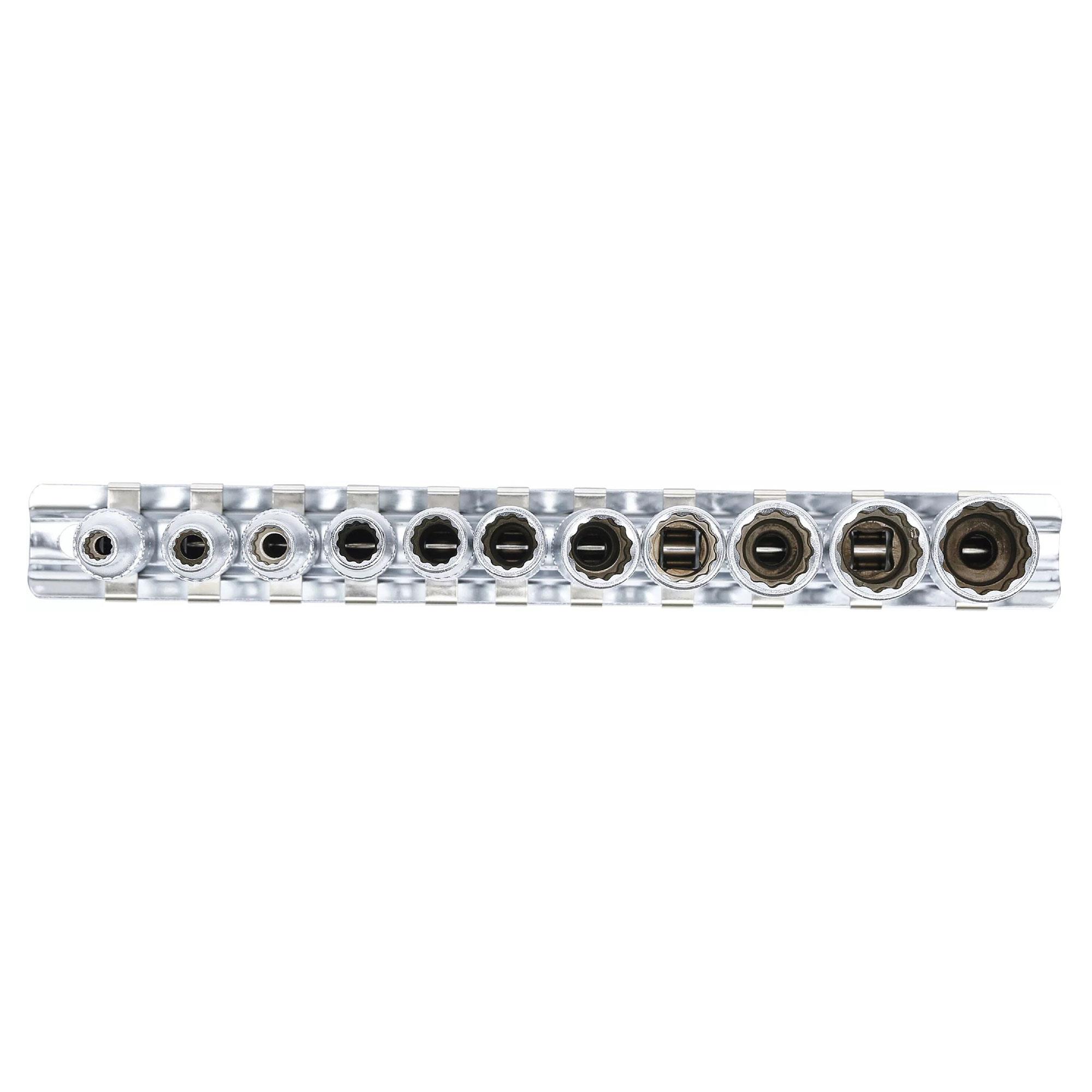 11-teiliges Steckschlüssel-Einsatz-Set mit 12-kant-Profil auf Metallschiene.