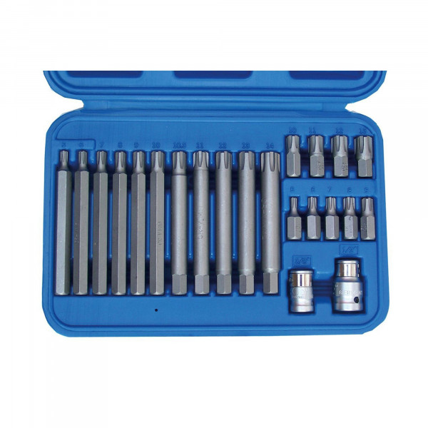 Dieses Set enthält 20 Bits für Keil-Profil (für Ribe) in Größen von M5 bis M13 (30 mm und 100 mm lang) und je einen Adapter zur Benutzung der Bits an einer 3/8" oder 1/2" Ratsche.