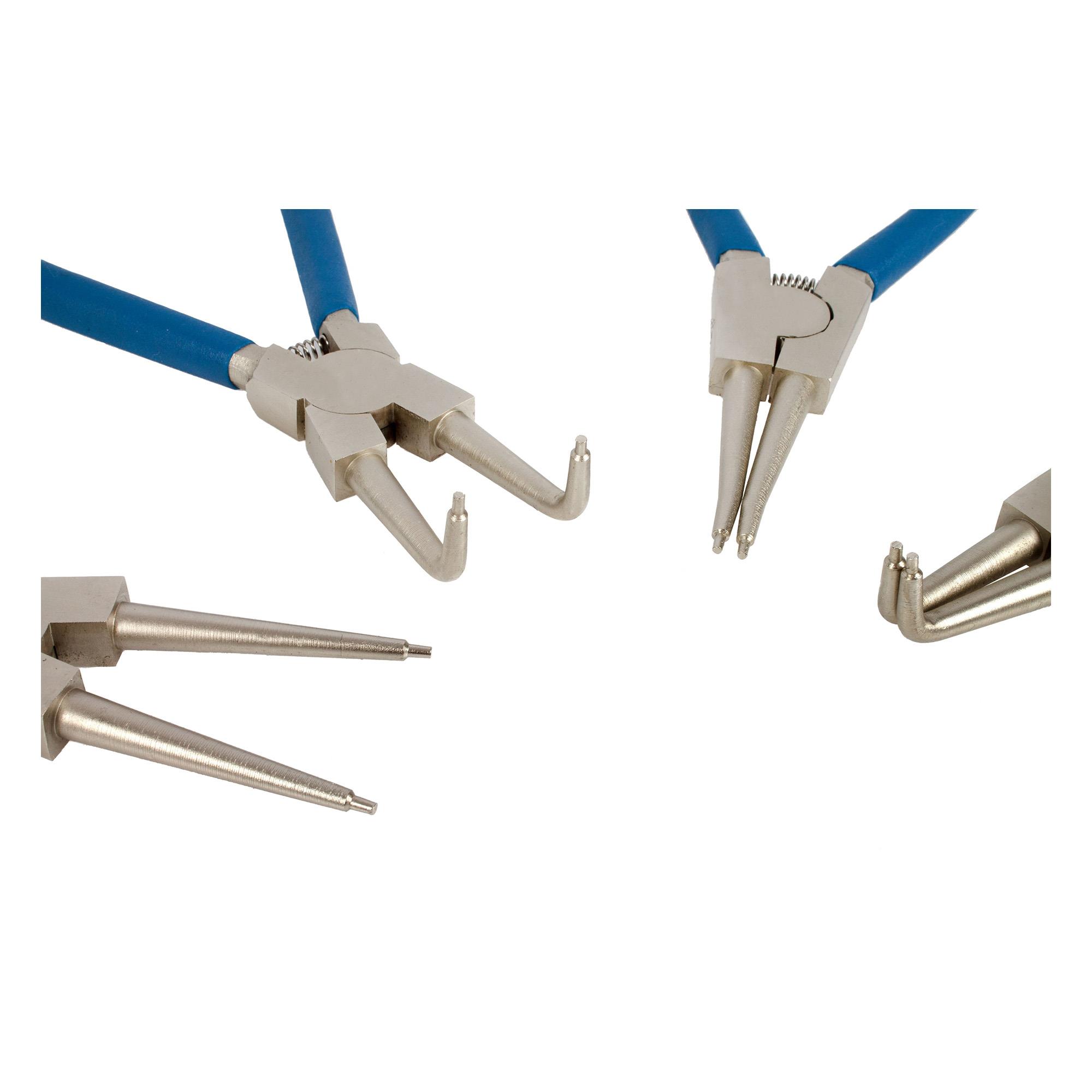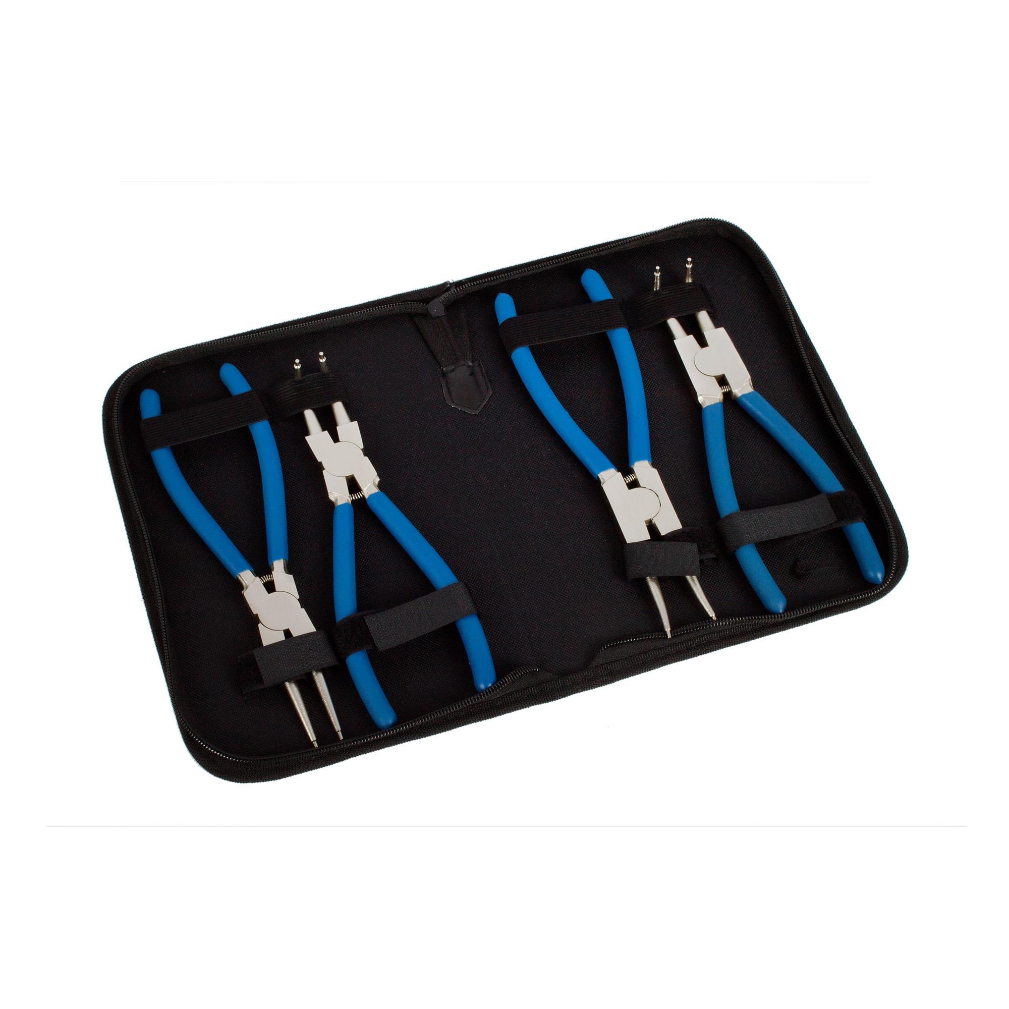 4-teiliges Set aus verschiedenen Zangen zum Entfernen von außen- und innenliegenden Sprengringen / Sicherungsringen in einer praktischen Aufbewahrungsmappe.
