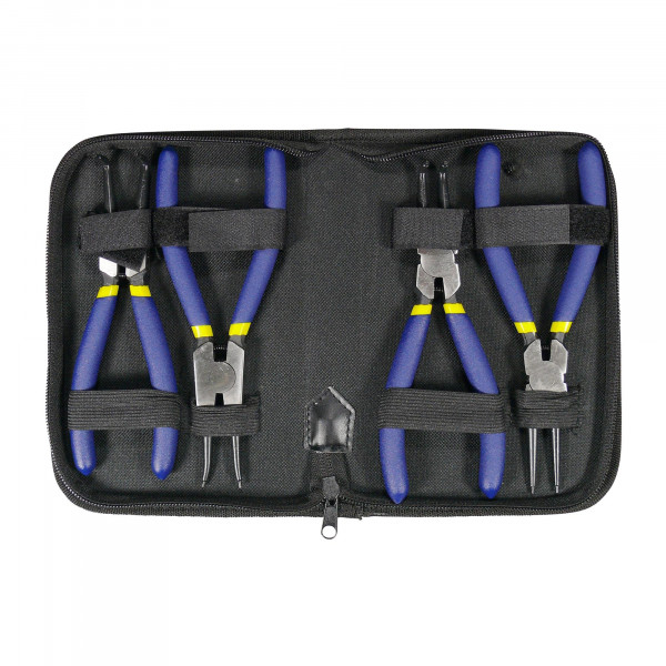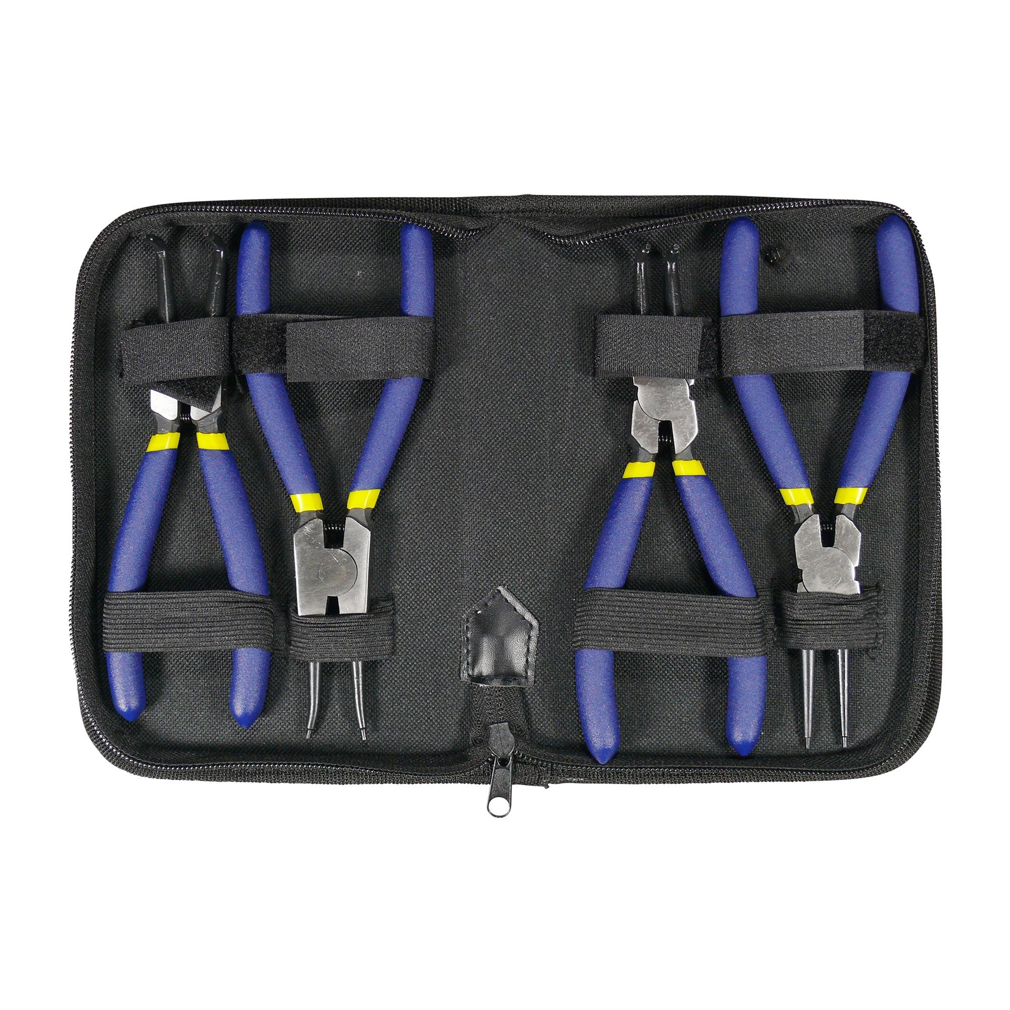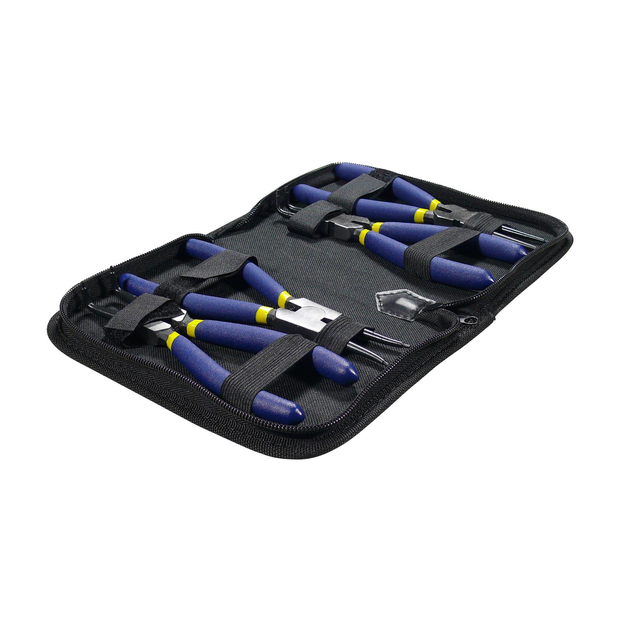 Set aus verschiedenen Zangen zum Entfernen von außen- und innenliegenden Sprengringen / Sicherungsringen in einer praktischen Aufbewahrungsmappe.