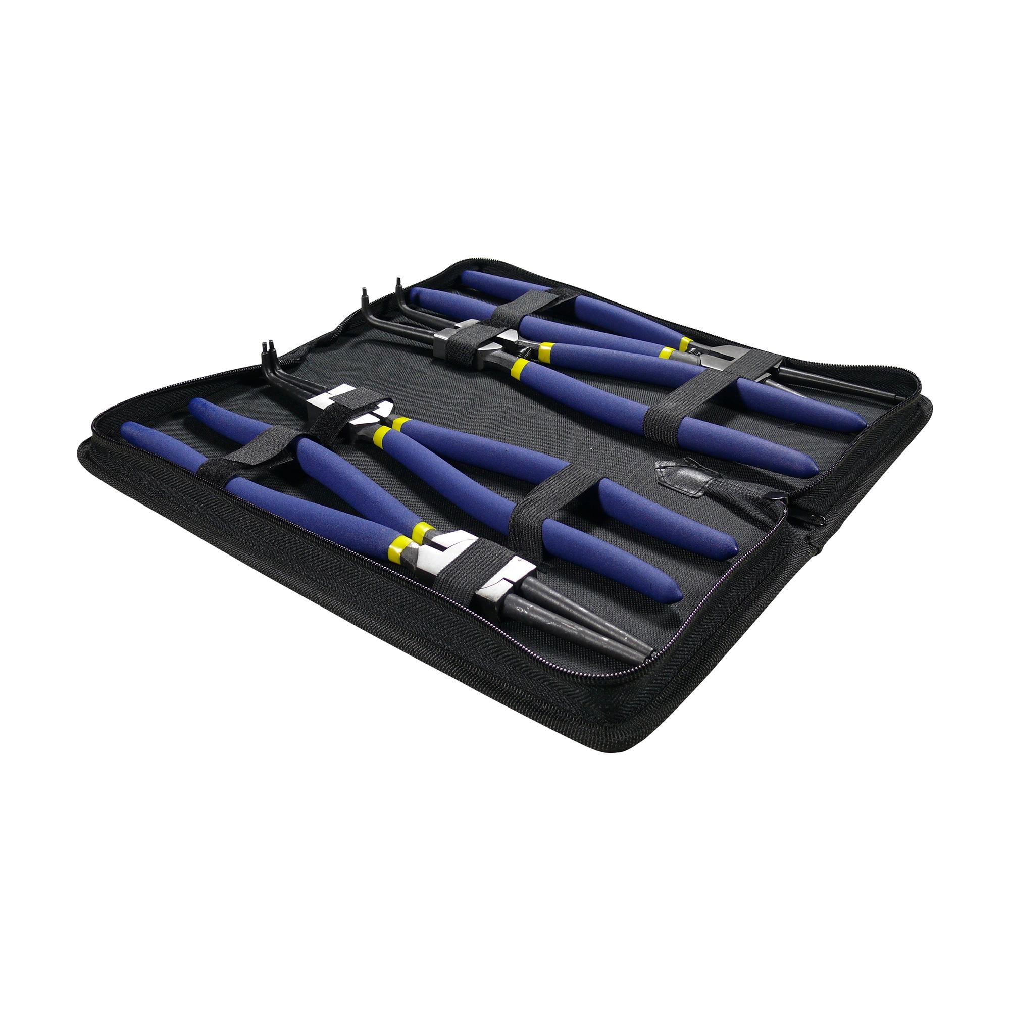 4-teiliges Set aus verschiedenen Zangen zum Entfernen von außen- und innenliegenden Sprengringen / Sicherungsringen in einer praktischen Aufbewahrungsmappe.