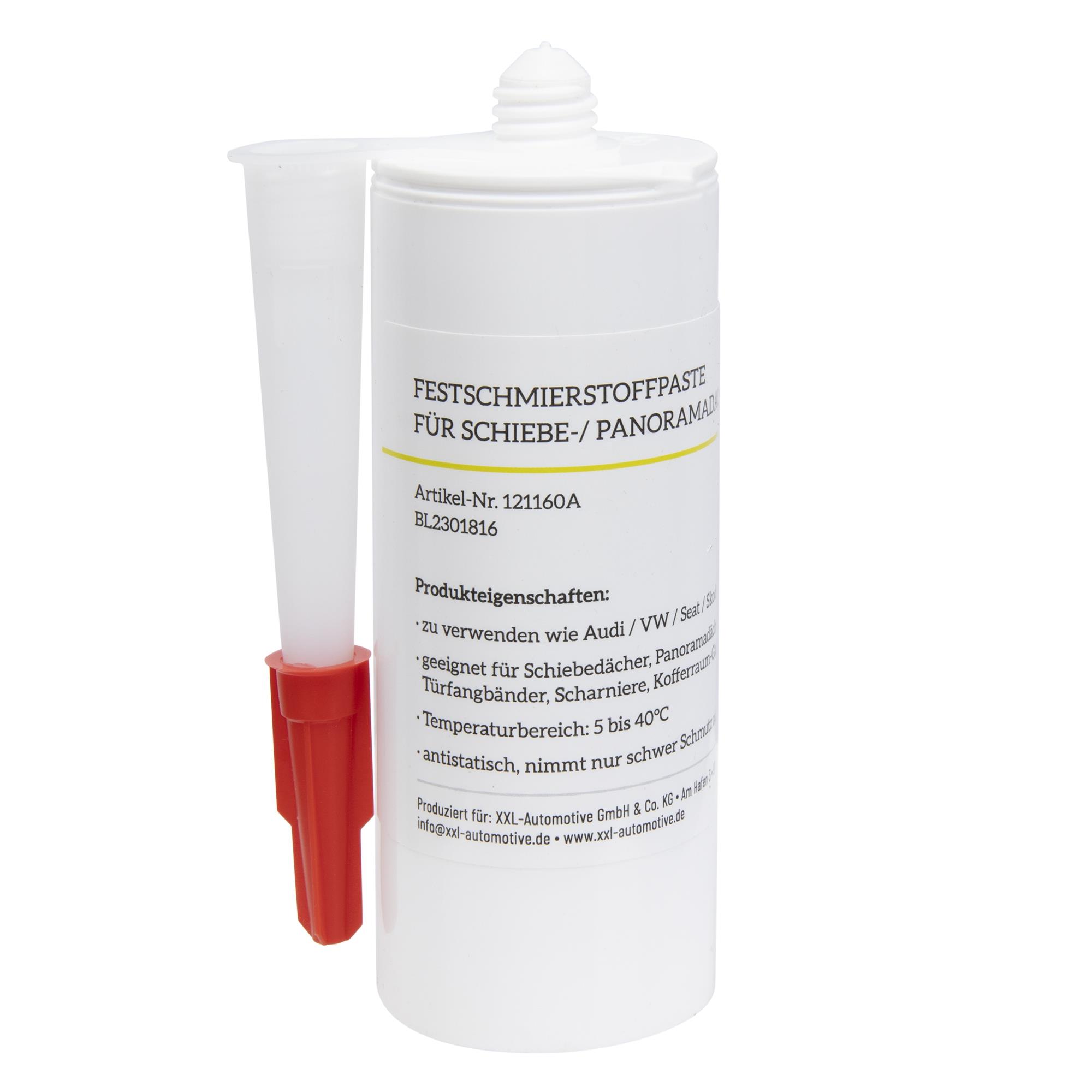 Das Glasschiebedach vom Golf 7.5 knarrte bei Verwindung (vor allem bei Auf- und Abfahrten im geschlossenen Zustand). Die Werkstatt meinte, der Dachhimmel gehört ausgebaut, weil der Rahmen etwas hat. Ich schmierte mit dieser Paste alle Punkte lt. Wartungsplan, siehe (höre) da: alles wieder leise!