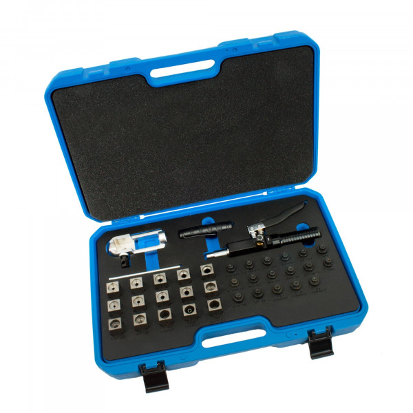 Umfasst verschiedene Größen von Werkzeugen und Adaptern zum Bördeln von Kraftstoff-, Brems-, Getriebe-Ölkühler- und Klimaanlagen-Leitungen.