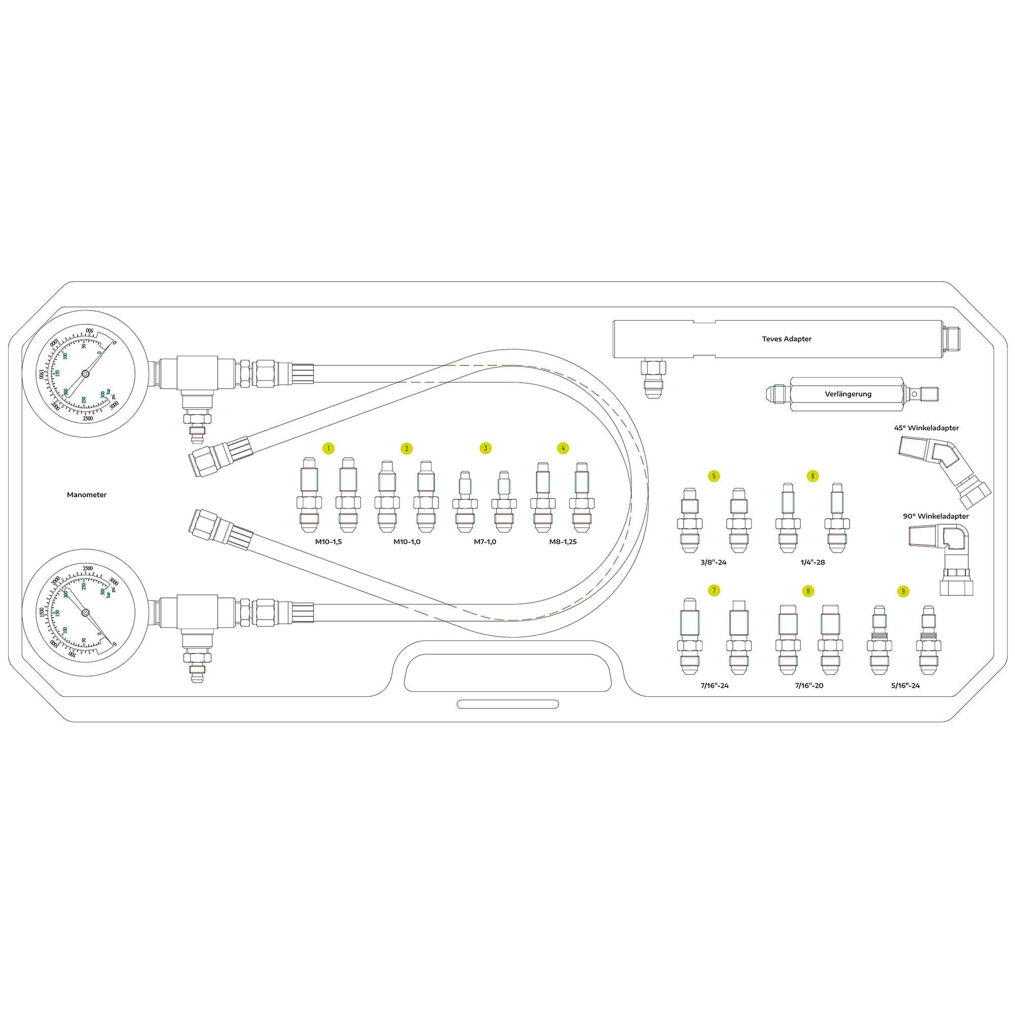 Der Bremsdruckprüfer wird mit Adaptern, die anstelle der Entlüftungsventile eingeschraubt werden und mit Schraubkupplungen an das Hydrauliksystem der Fahrzeugbremse angeschlossen, geliefert.
