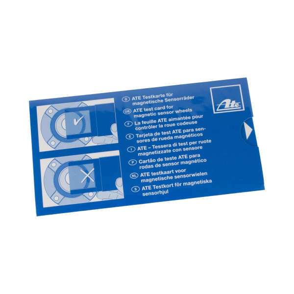 Die ATE Testkarte für magnetische Sensorräder macht die einzelnen Magnetsegmente der Sensorräder sichtbar und ermöglicht somit deren einfaches, kostengünstiges und zuverlässiges Prüfen. Dazu muss die Testkarte mit dem Prüffenster lediglich auf das magnetische Sensorrad aufgelegt werden. Die Nord- und Südpole der Magnetfelder erzeugen eine farbliche Veränderung des Teststfeldes. Ein unregelmäßiger Verlauf der Nord- und Südpole deutet auf ein defektes Sensorrad hin.