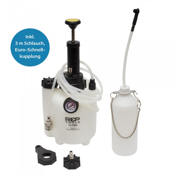 Europäische Adapter und Auffangflasche für Bremsflüssigkeit im Lieferumfang enthalten.