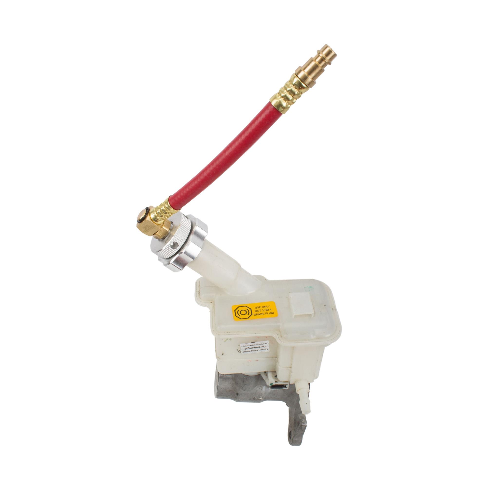 Durch das Drehen der gerändelten Aufsatzschraube kann der Dichtring im Durchmesser verstellt werden. Somit lässt sich der Bajonettverschluss auf viele verschiedene Bremsflüssigkeitbehälter einstellen und dichtet diese perfekt ab. Nun kann ein Bremsenentlüftungsgerät (z.B. Art.-Nr. 117905) an den DN 7,2 Schnellkupplungsverschluss des abgewinkelten Adapterschlauch angeschlossen und die Bremsanlage mühelos entlüftet werden.