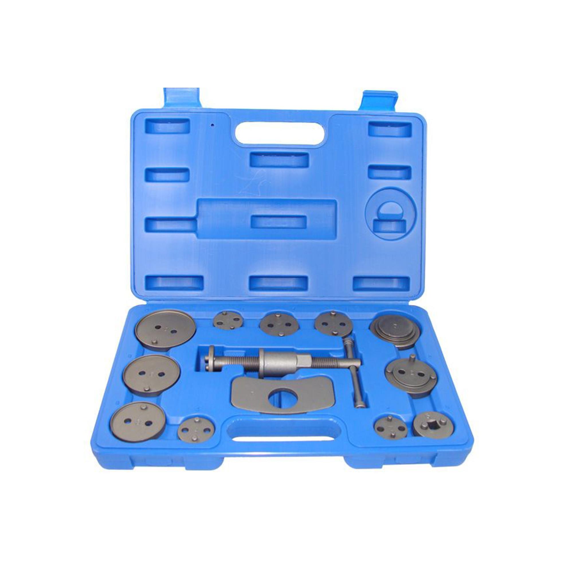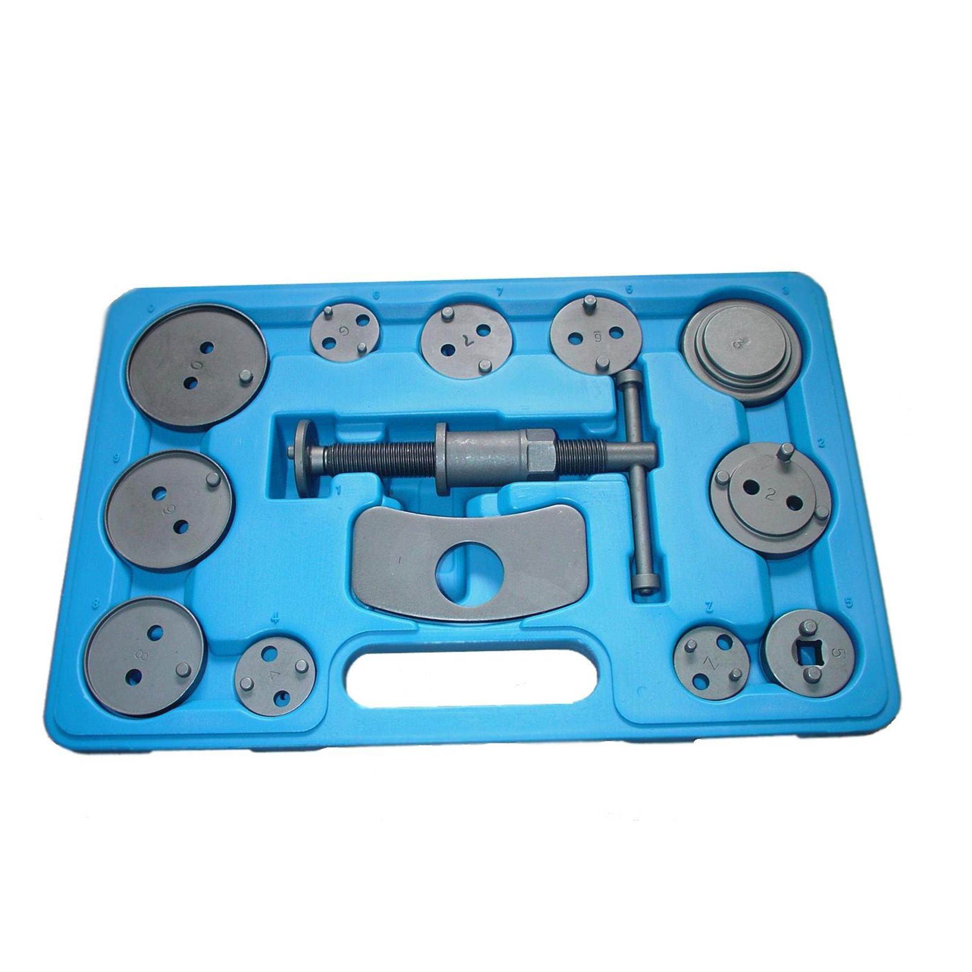 - Werkzeugsatz zum Zurückdrücken des Bremskolbens an vielen verschiedenen Modellen - Rechtsdrehende Spindel mit magnetischen Adapter und 11 Adapterplatten