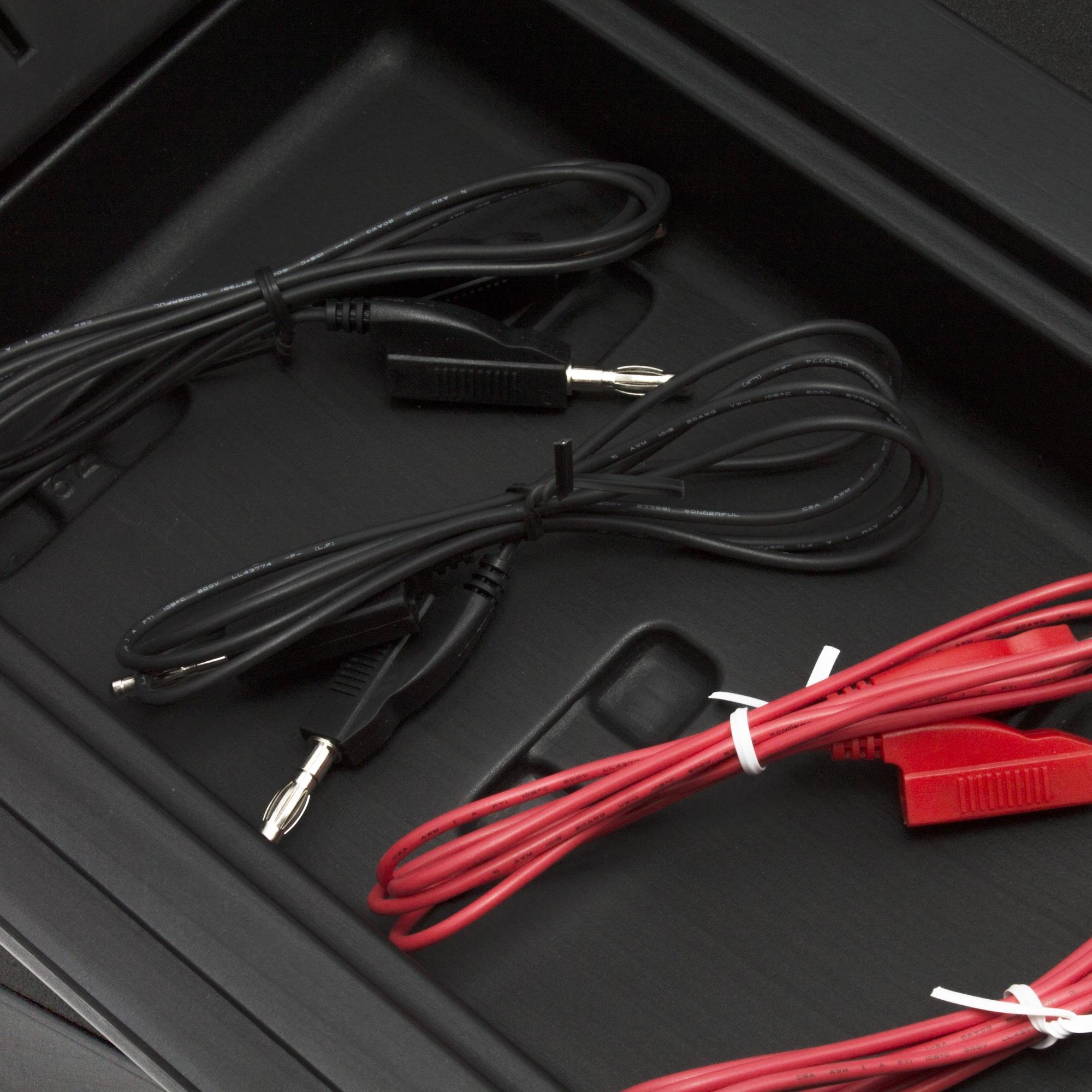 - 2 x Verlängerungs-Kabel rot, mit je 2 Bananenstecker mit integrierten Bananenbuchsen, Länge: 1.100 mm