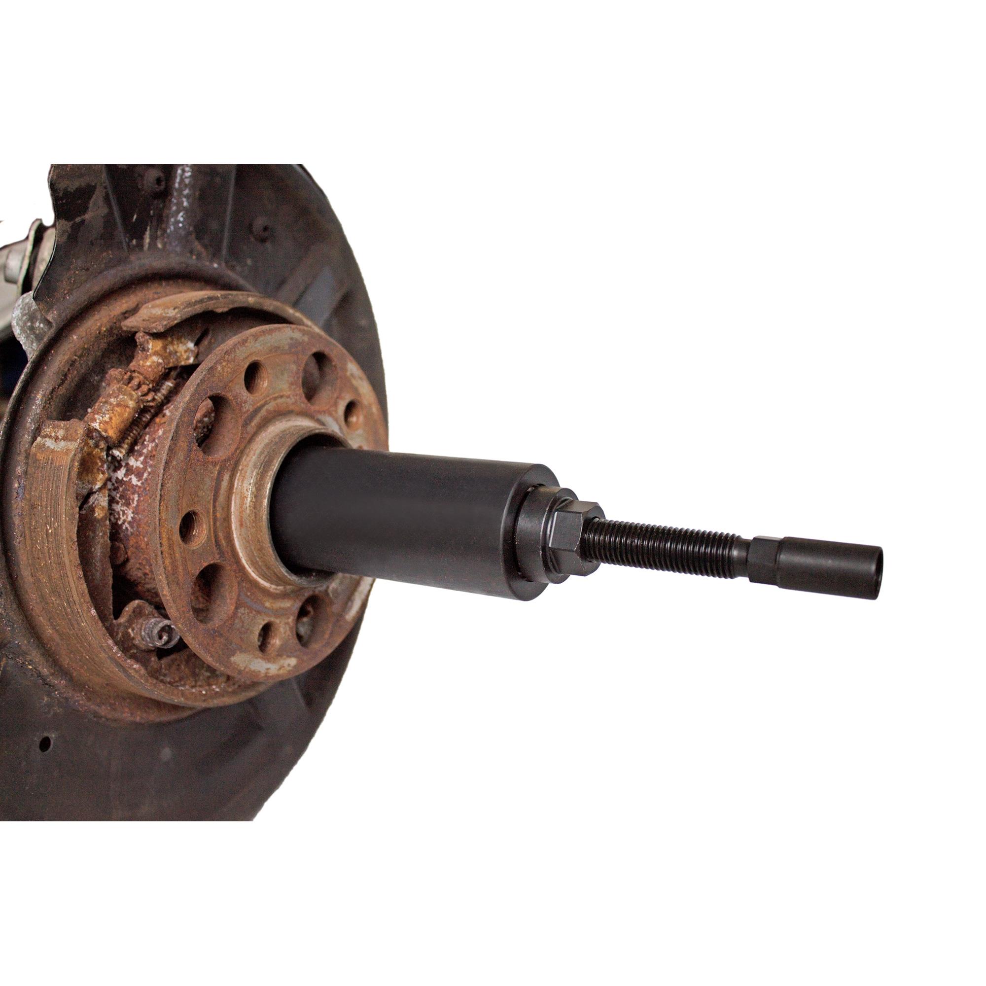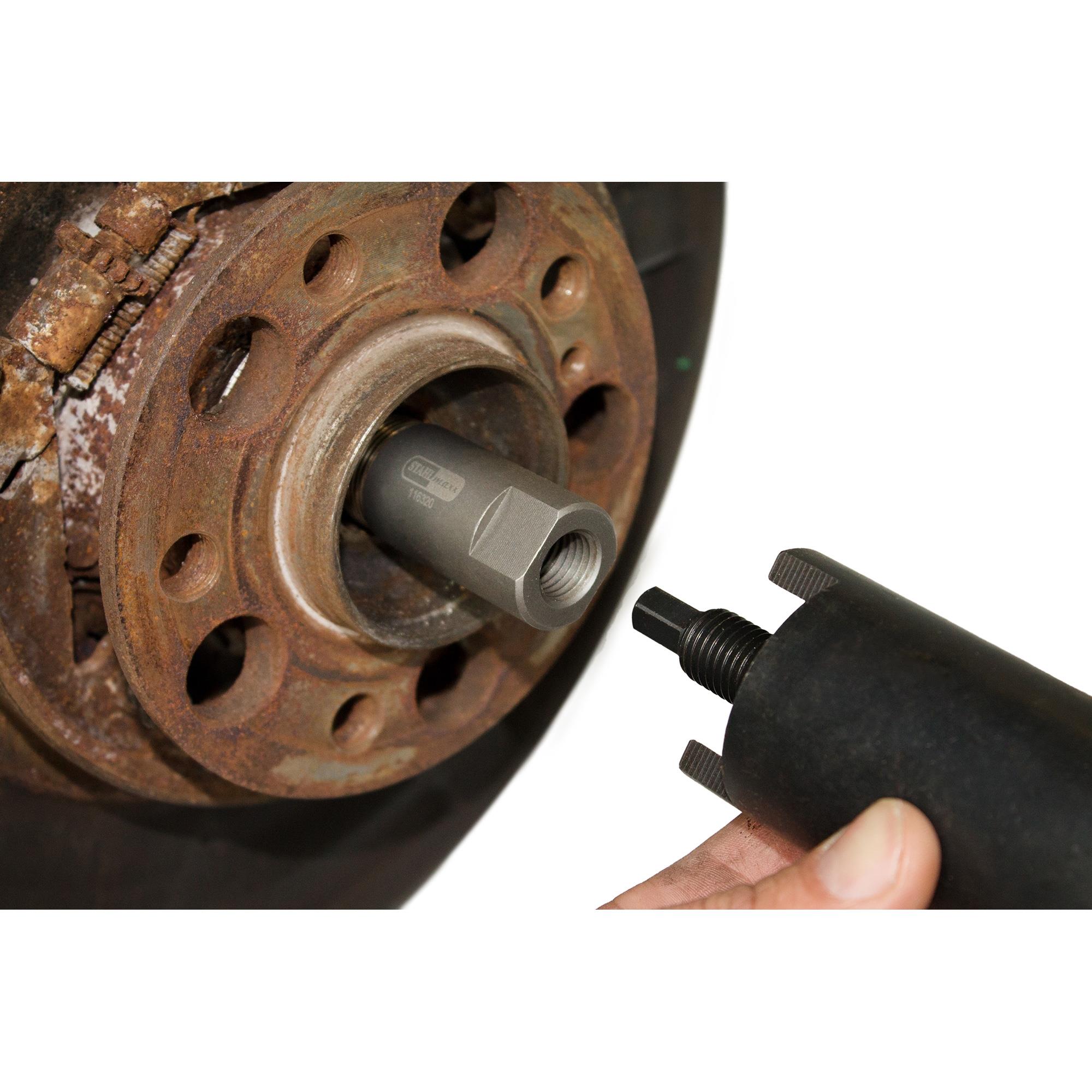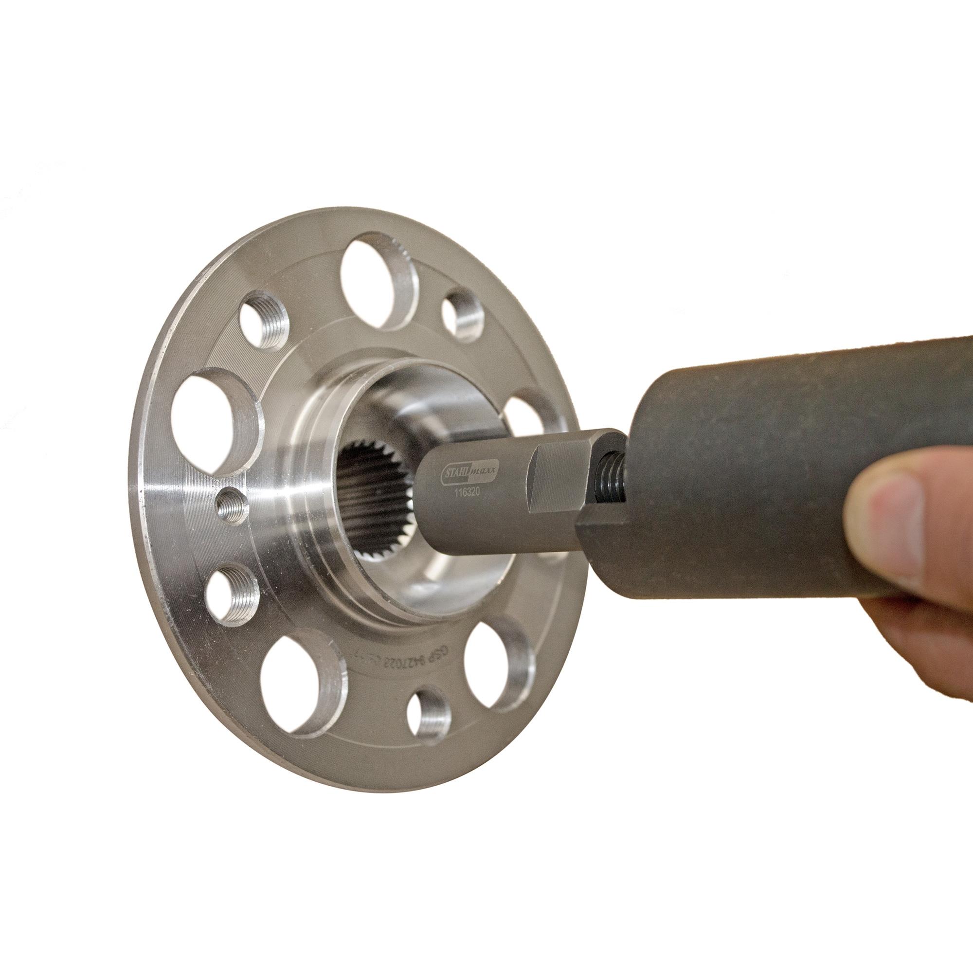 Nach dem Radlagerwechsel ist es bei vielen Fahrzeugen mit Heckantrieb (z.B. Mercedes und BMW) notwendig, die Radnabe von Außen mithilfe der Antriebswelle von Innen einzupressen.