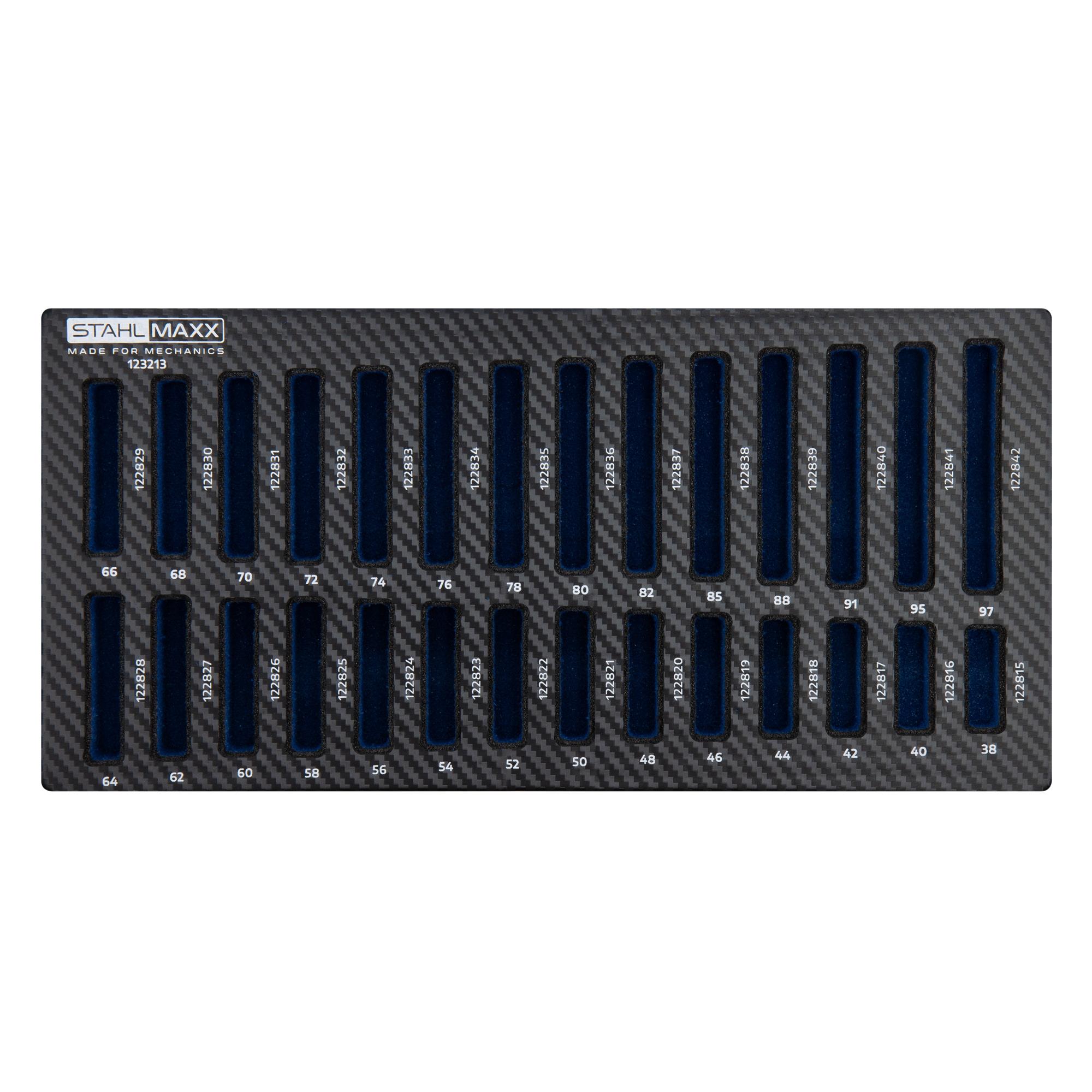 Alle Druckstücke / Druckplatten können bei Bedarf einzeln bestellt werden. Wir empfehlen die Aufbewahrung im Werkstattwagen oder Transportwagen (Höhe der befüllten Einlage: 92 mm).