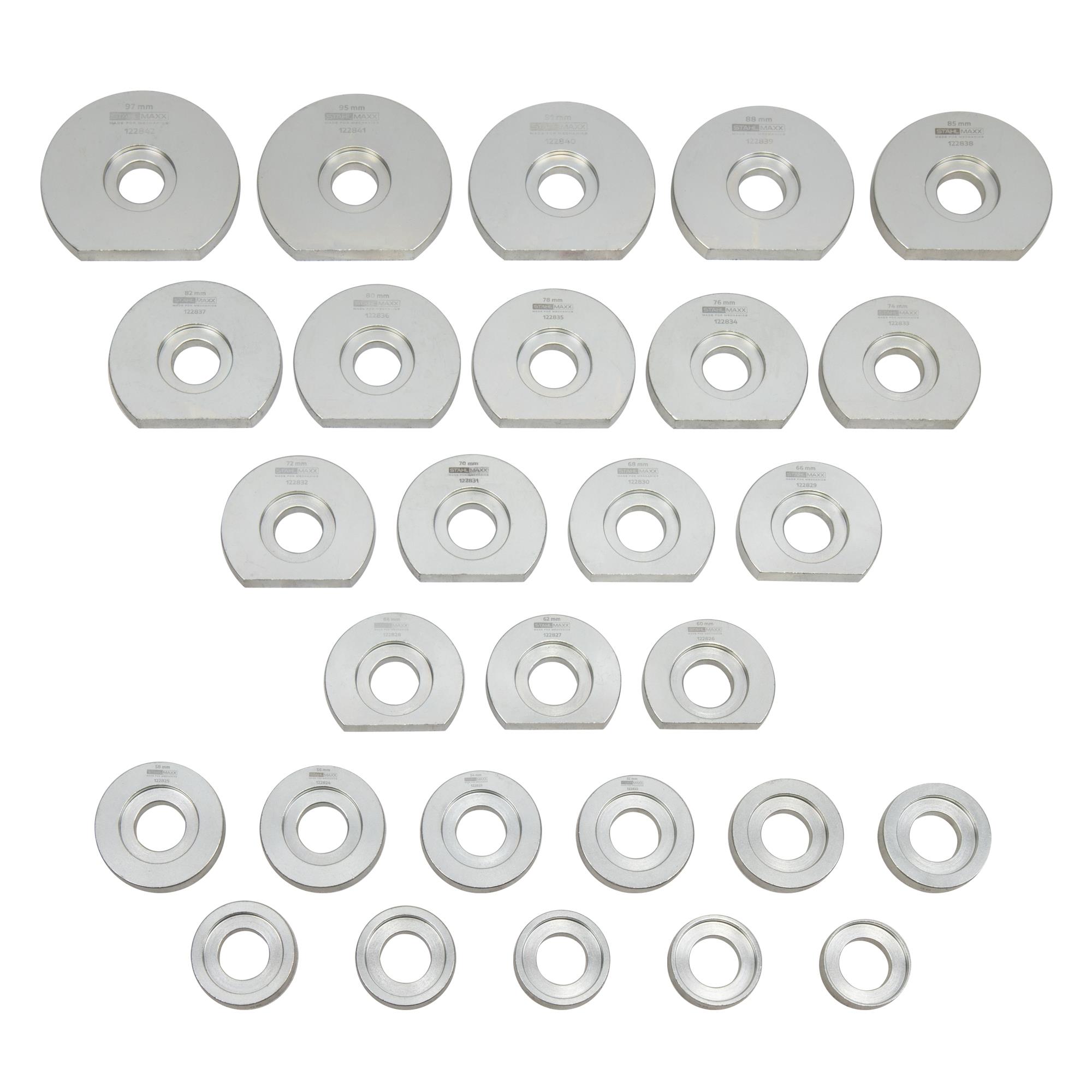 Viele Radlager, Gummilager und Dichtringe lassen sich mit einer passenden Auflage problemlos ein- und auspressen. Mit diesen 28 Druckstücken ist dem Mechaniker eine breite und universelle Abdeckung der meisten De- und Montagearbeiten garantiert.