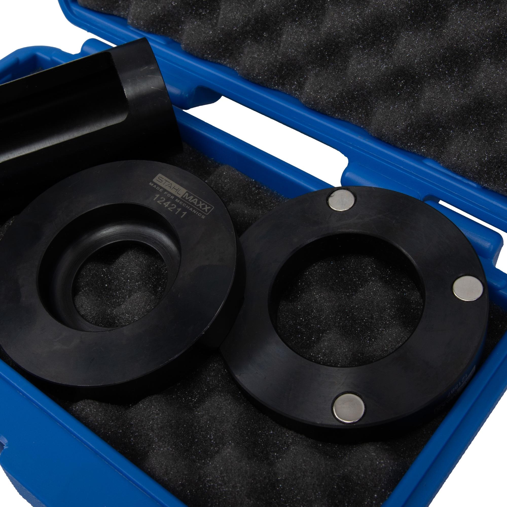 Die speziell, mit Querstange, geformten Buchsen der Hinterachslagerung an Opel Combo und Fiat Doblo Modellen, macht den Einsatz spezieller Druckstücke erforderlich. Dieser Druckstücksatz dient zur Erweiterung des Pressrahmens (z. B. Art.-Nr. 117766). Der Austausch der Hinterachsbuchse erfolgt direkt am Fahrzeug ohne Ausbau der Hinterachse. Mit diesen Druckstücken lässt sich die Längslenkerbuchse schnell und einfach aus dem Achslenker Aus- und Einbauen. Die Adapterringe besitzen 4 eingearbeitete Magnete, sodass dieser nicht mit der Hand gehalten werden müssen.