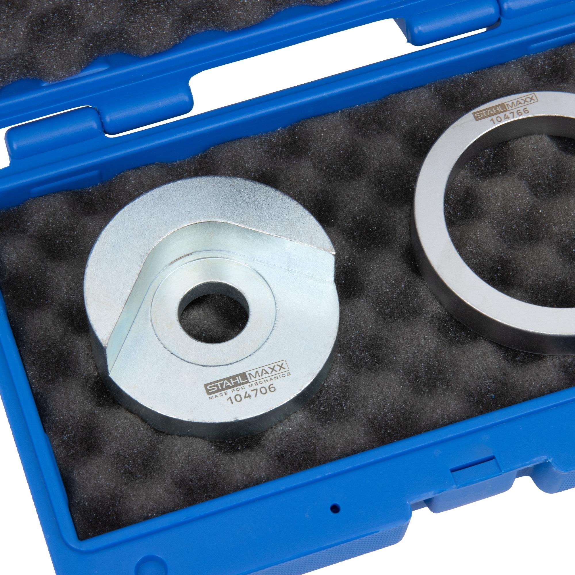 Spezialwerkzeug-Satz zum problemlosen Einpressen der Hinterachslager bei Opel Fahrzeugen. Zu verwenden mit Pressrahmen Art.-Nr. 117766 und 117765.