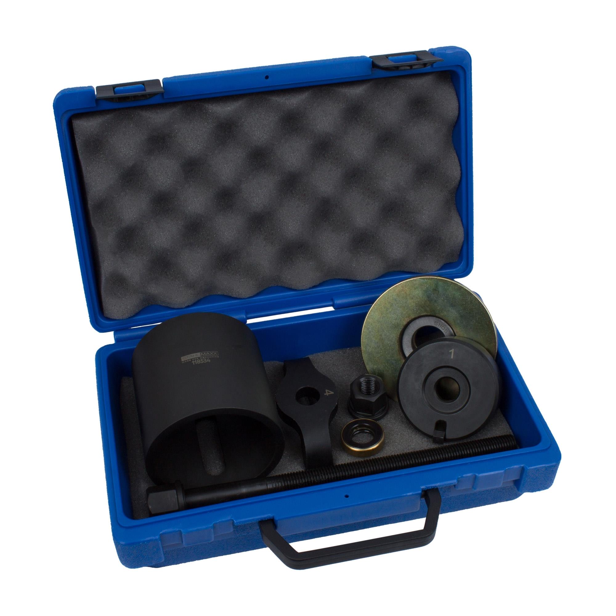 Dieser Spezialwerkzeugsatz dient zum Austausch der vorderen und hinteren Gummi-Metalllagerungen im Hinterachsträger. Das Erneuern der Buchsen ist mit diesem Werkzeug ohne Ausbau der Hinterachse, direkt am Fahrzeug zeitsparend möglich.