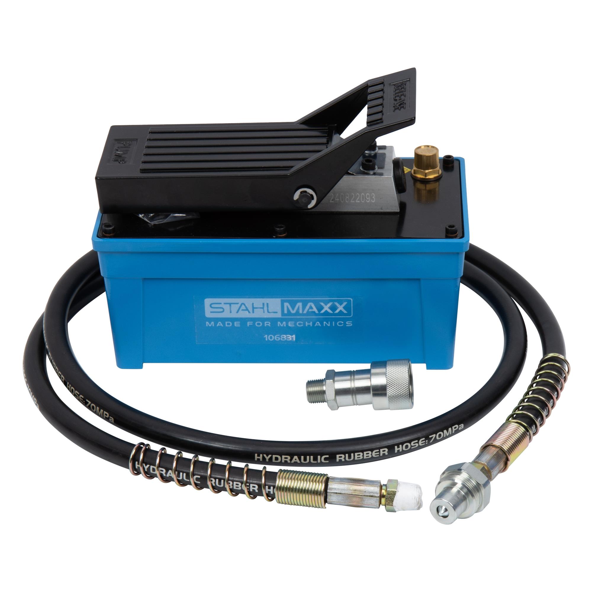 Leistungsstarke und robuste Druckluft-Hydraulik-Pumpe (689 bar / 10.000 PSI), mit Fußschalter, Schnellkupplung und 2,2 m langem Hydraulik-Schlauch.