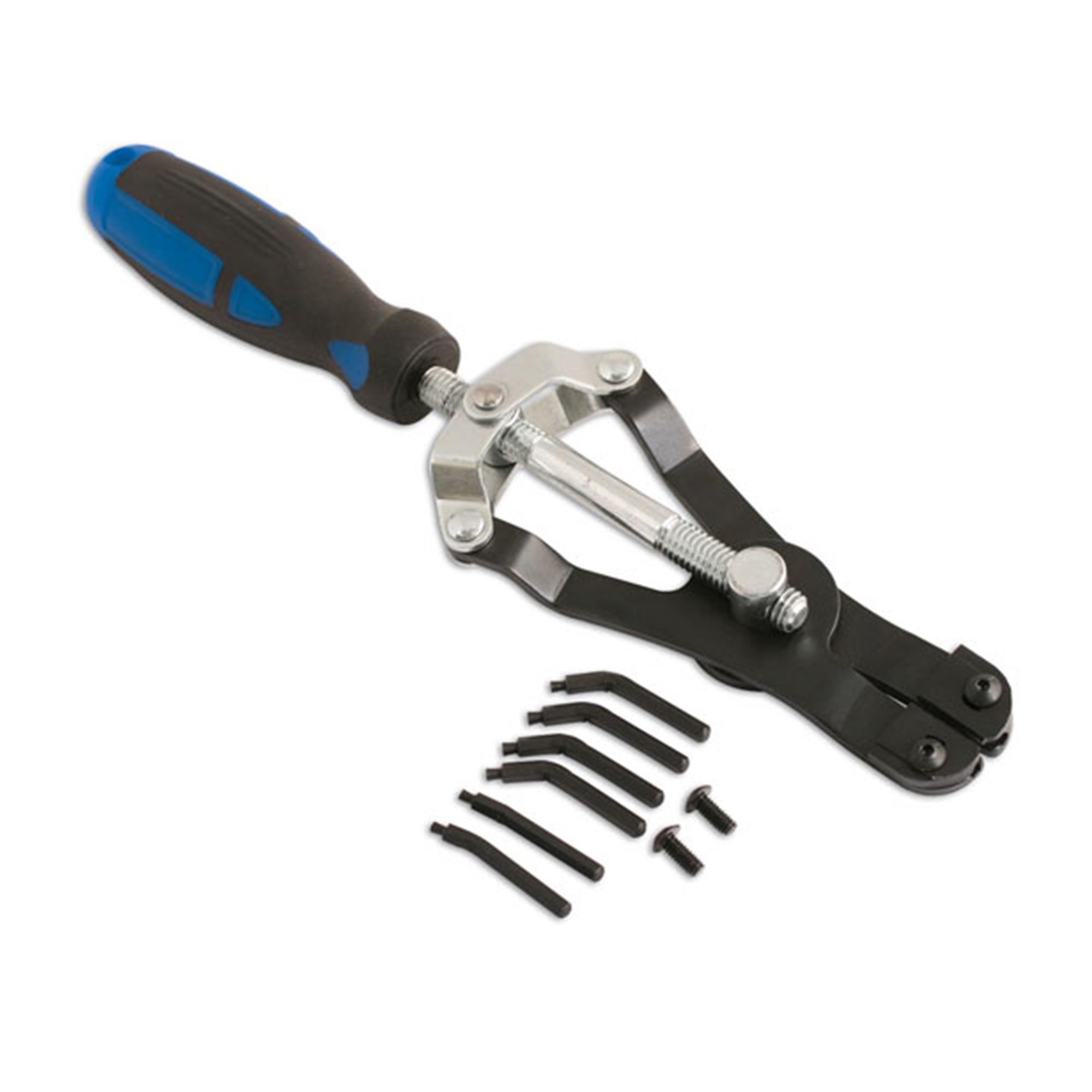 Um dem Mechaniker die Arbeit erheblich zu erleichtern und den Sicherungsring auf komfortable Weise, ohne dessen Zerstörung, auszubauen, haben wir diese professionelle Sicherungsring-Zange im Sortiment aufgenommen.