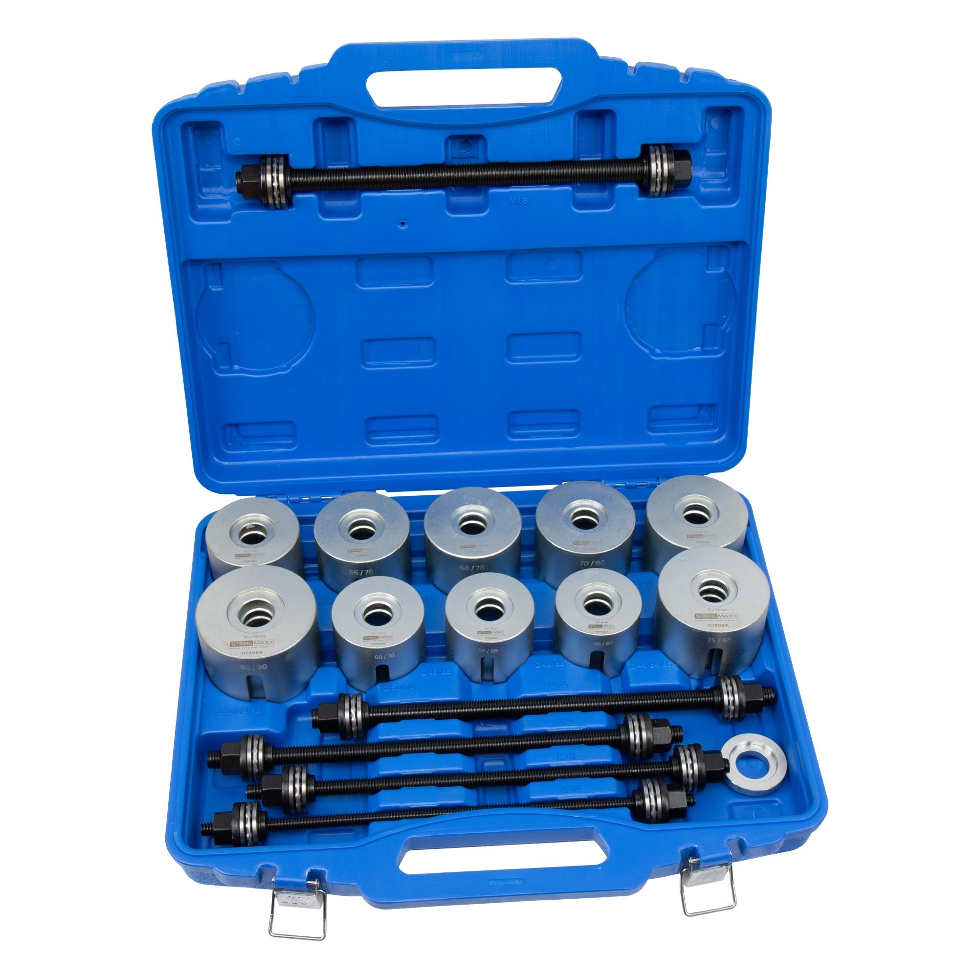 Dieses Spezialwerkzeug-Set zur De- und Montage von Standard-Radlagern und Silentlagern mit Durchgangsbohrung (für andere Anwendungen werden Halbschalen oder ein Pressrahmen benötigt) ist ein unverzichtbares Hilfsmittel für die fachgerechte und zeitsparende Fahrzeugreparatur. Auch große Standard-Radlager (z. B. VW Touareg / Audi Q7) oder Gummilagerungen lassen sich mit dem Set problemlos erneuern.