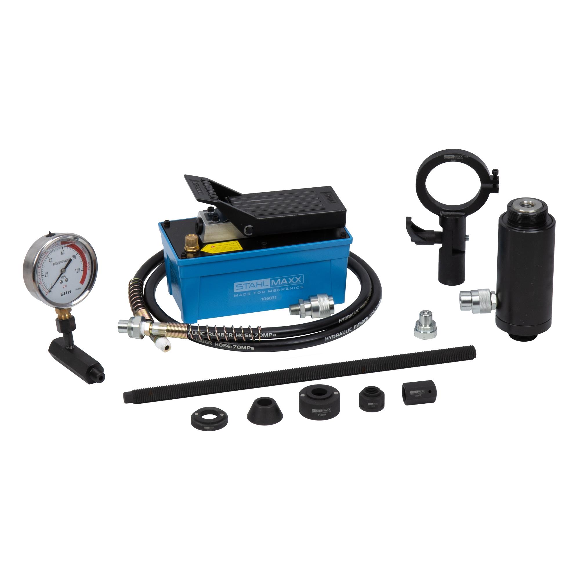 Der Hydraulikzylinder findet dank des schwenkbaren Halters Platz auf dem Getriebeheber und die Druckluft-Hydraulik-Fußpumpe inkl. gut ablesbarem 0–1000 bar Manometer ermöglicht komfortables und sicheres Arbeiten.