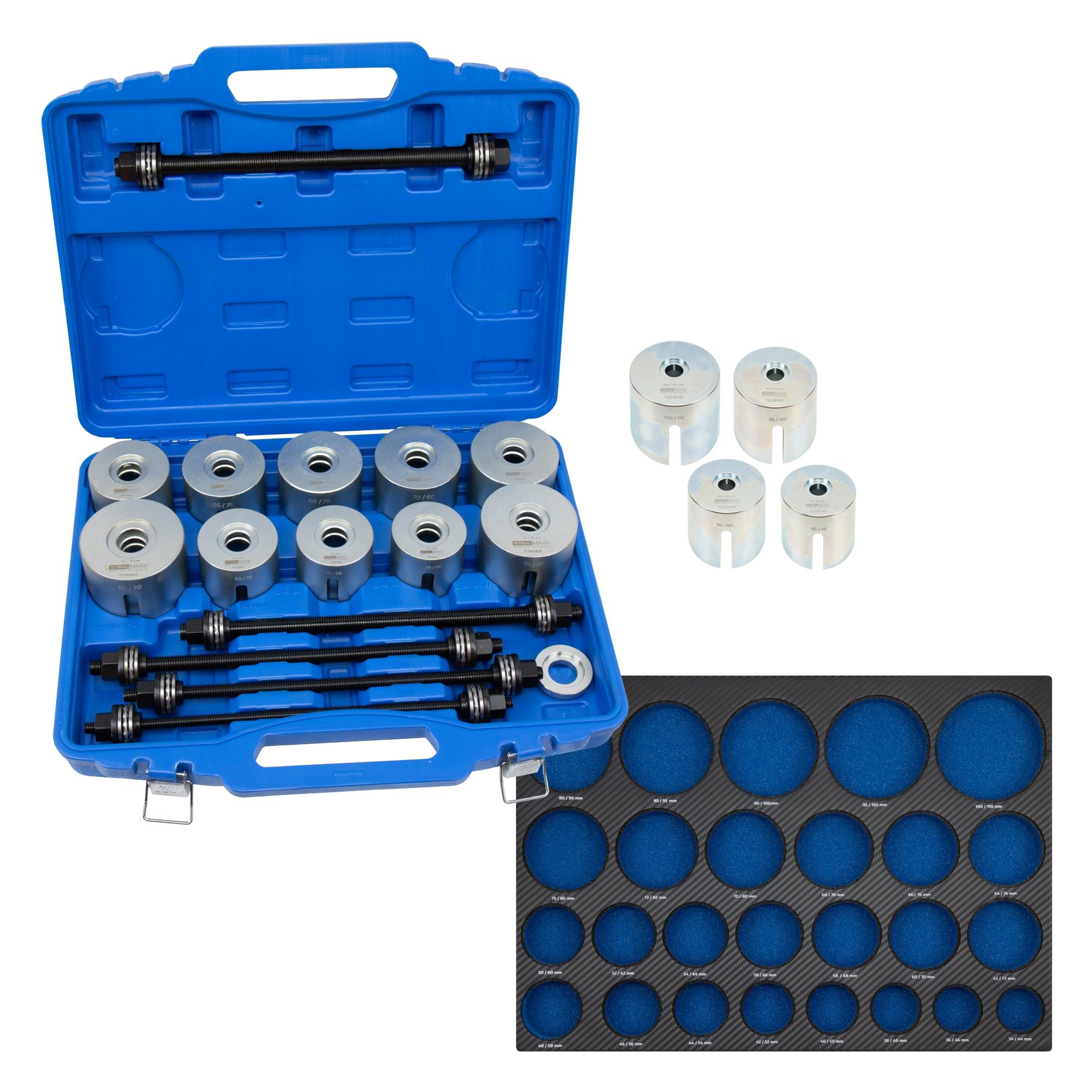 Für nahezu alle Standard-Radlager, Querlenker-, Vorder- und Hinterachslagerungen mit Durchgangsbohrung können sowohl die Zug- und Druckhülsen, als auch die 28 Pressscheiben verwendet werden. Der 28-tlg. Zug und Druckhülsensatz beinhaltet 5 Trapezgewindespindeln die auch eine mechanische Anwendung ermöglichen. Diese werden komfortabel mittels 5 Lochwand-Doppelhaken an der Seite des Servicewagens aufgehangen. Zusätzlich sind die 4 Druckhülsen mit Innen-Ø 85–100 mm enthalten. Diese Komponenten haben in einer praktischen Schaumeinlage mit gut lesbarer Beschriftung ihren Platz.