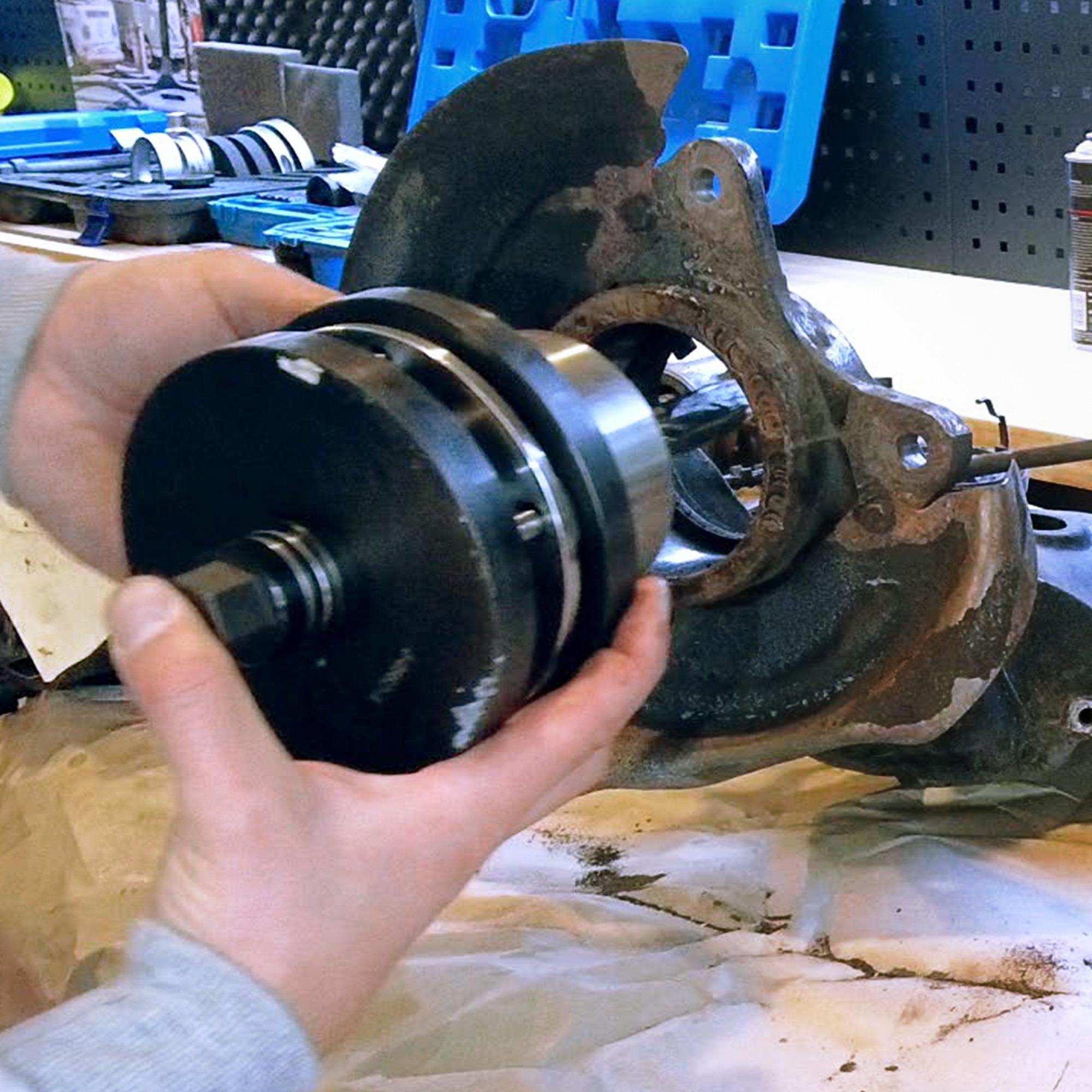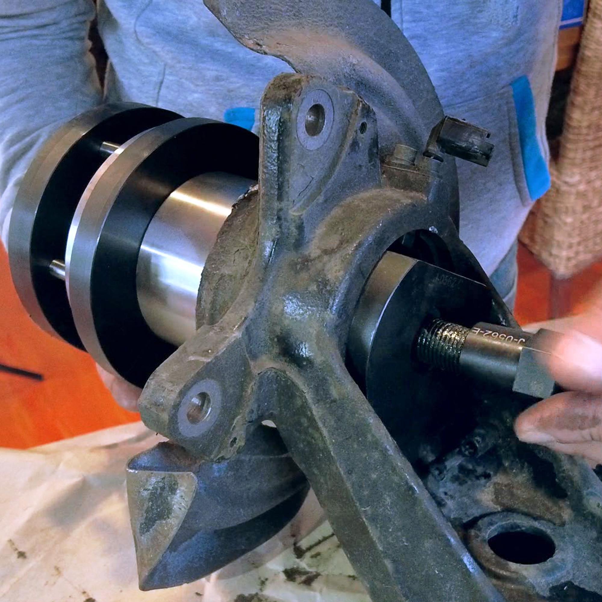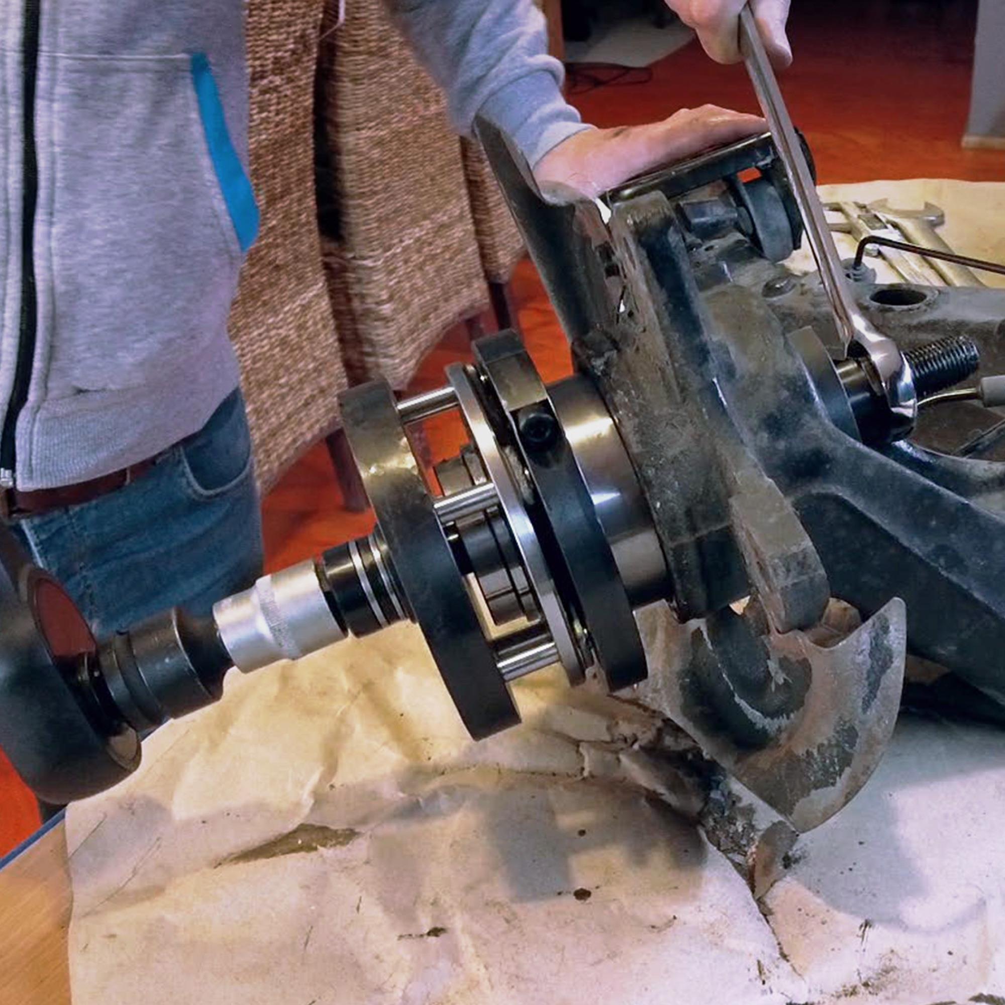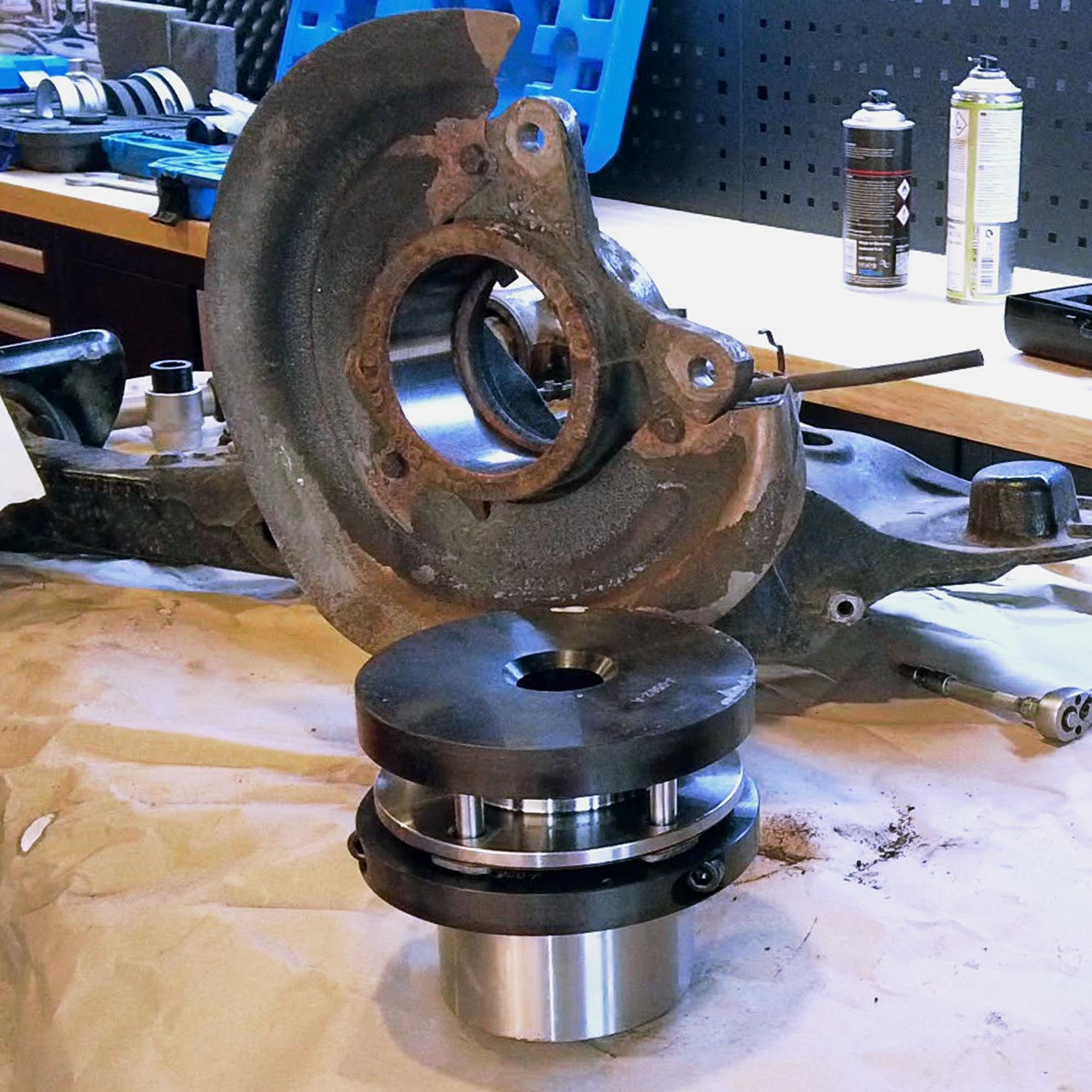 Mit diesem Werkzeug ist es möglich die Kompletteinheit Radlager/Radnabe an der Hinterachse zu wechseln, ohne den Achschenkel auszubauen. Der Komplette Demontage- und Montagevorgang findet direkt am Fahrzeug statt.