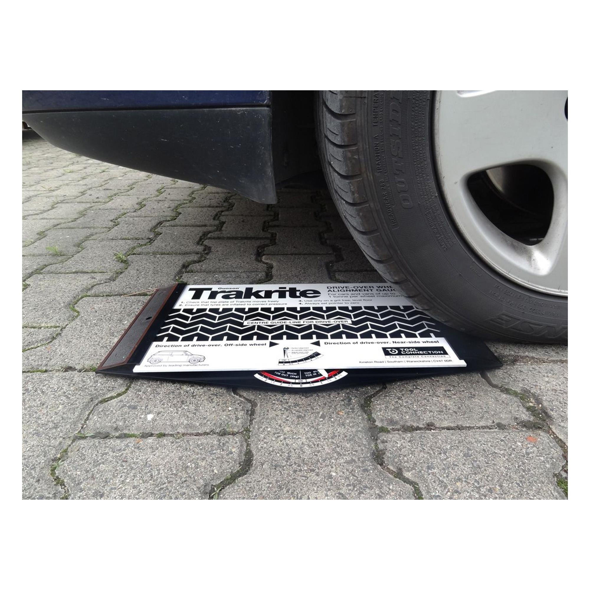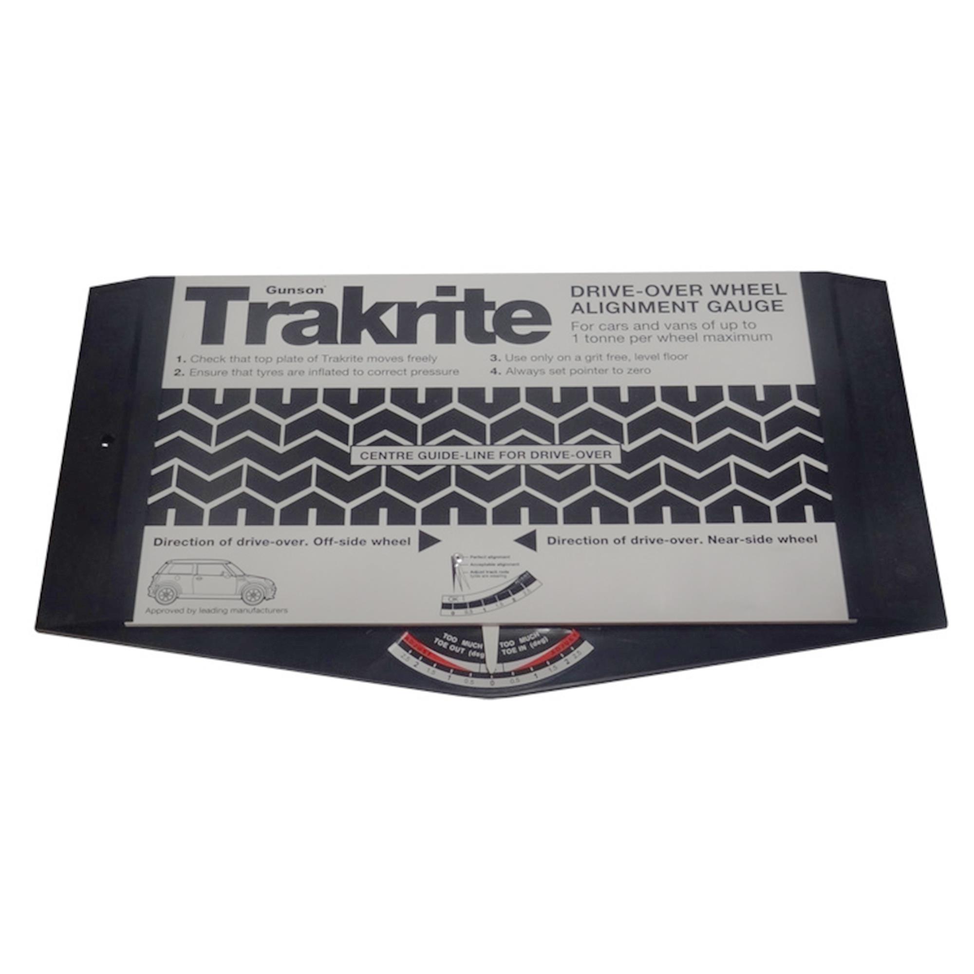 Das Trakrite Achsmessgerät hat eine obere Platte, die auf Rollen montiert ist, sodass sie Seitenbewegungen frei ausführen kann. Wenn ein Rad auf die Platte gefahren wird, verursacht jede Fehlausrichtung ein seitliches Wegdrücken der Platte. Ein Innengestänge bewegt eine Nadelanzeige, die auf einer Skala die Gesamtbewegung der Platte und somit die Fehlausrichtung angibt. Nach dem Einsatz wird die Nadelanzeige vom Benutzer wieder in die Mittelstellung gebracht.