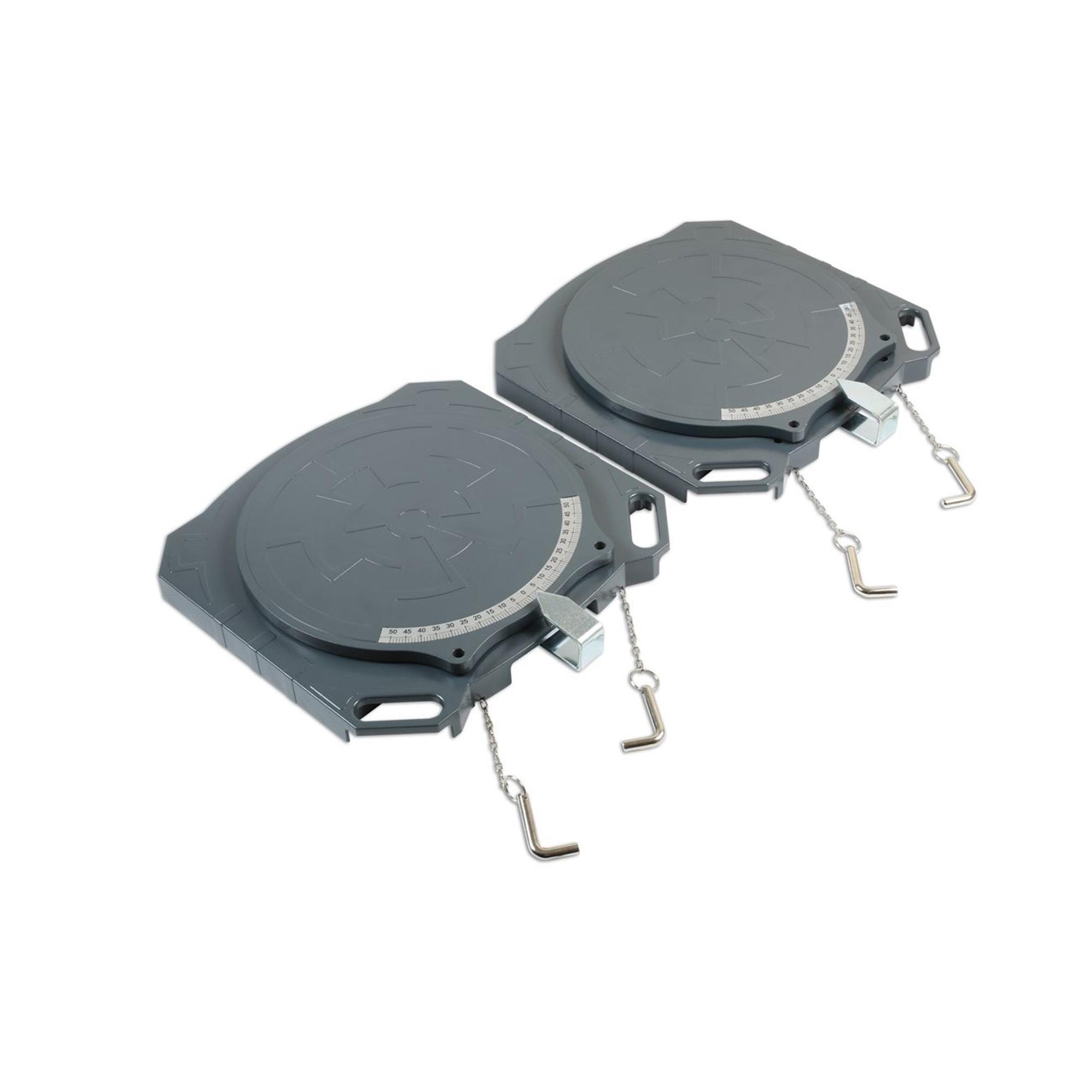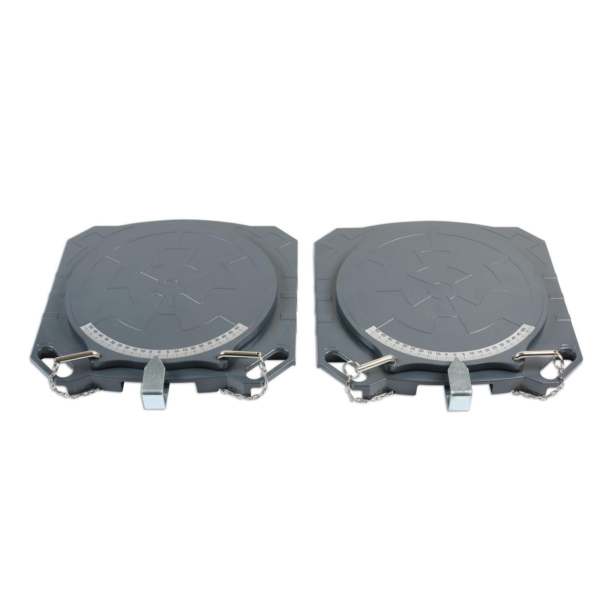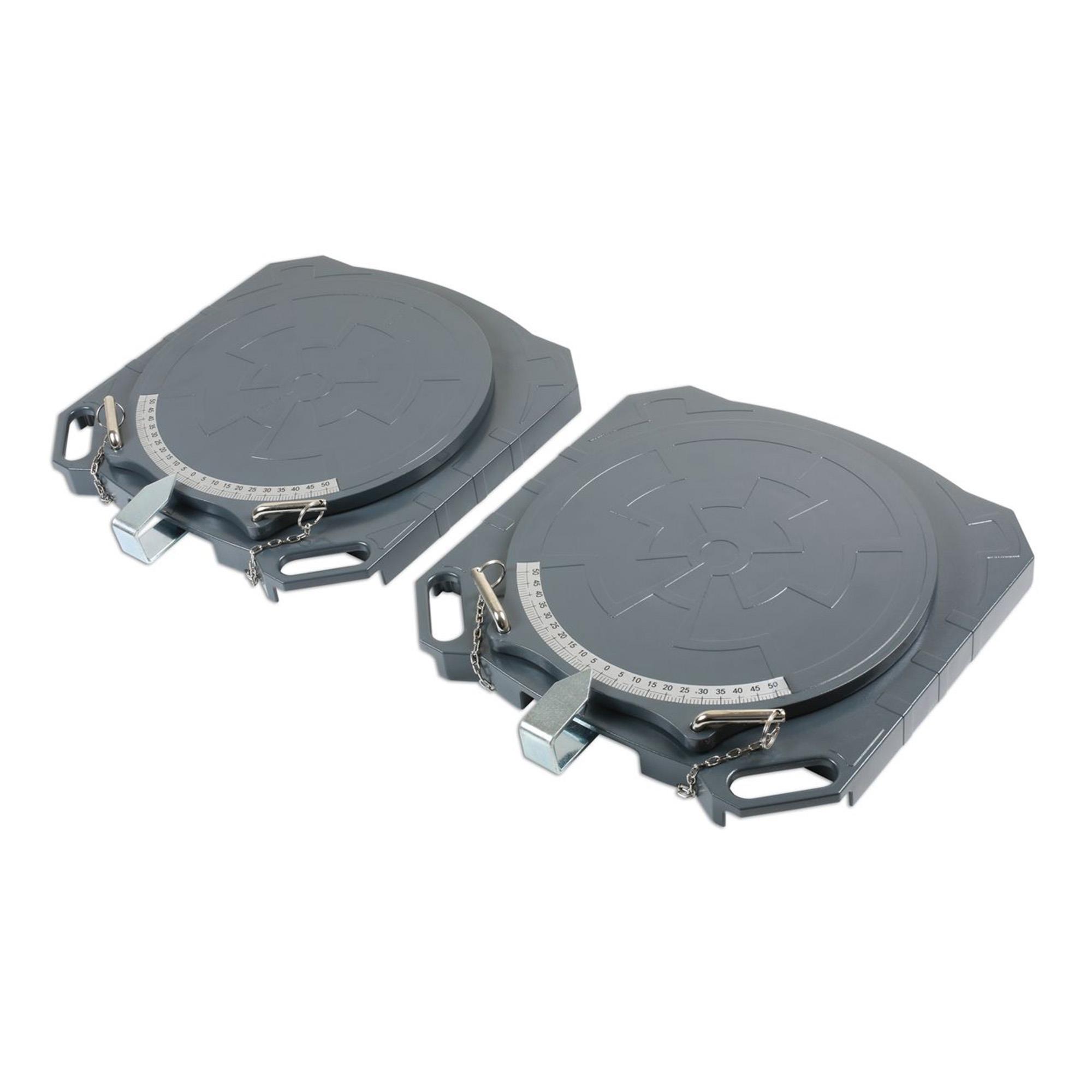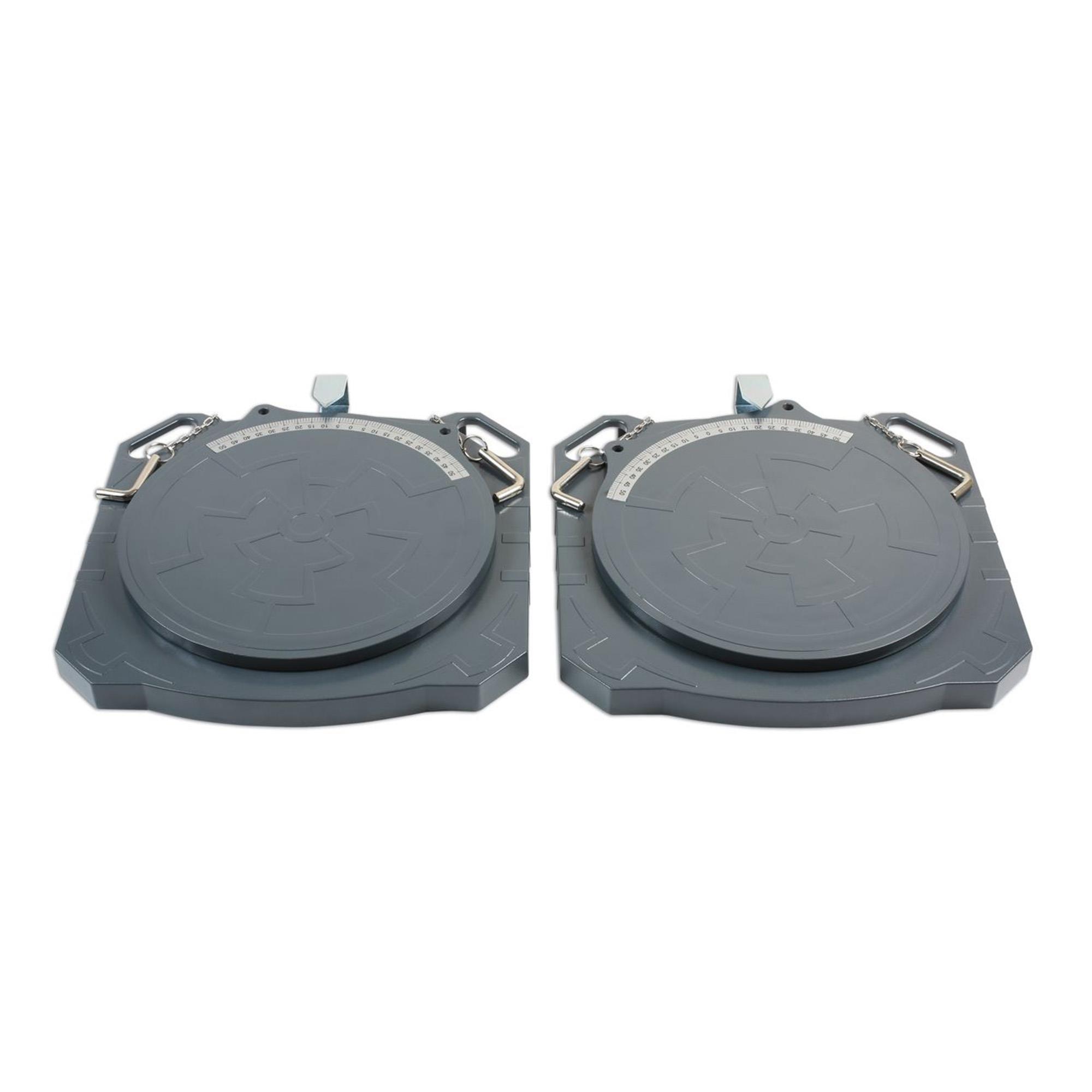 Die Drehscheiben, 2 Stück im Lieferumfang enthalten, für die Sturz-/und Spureinstellung wurden aus festem Aluminium gefertigt, sie sind zugleich mit 5 kg sehr leicht und mit 2 t pro Seite extrem tragfähig. Dies ermöglicht selbst schwere Fahrzeuge problemlos und ohne Gefahr auf Beschädigung zu vermessen. Im normalen Pkw Bereich erweist sich die hervorragende Stabilität ebenso als hoher Faktor der Langlebigkeit.