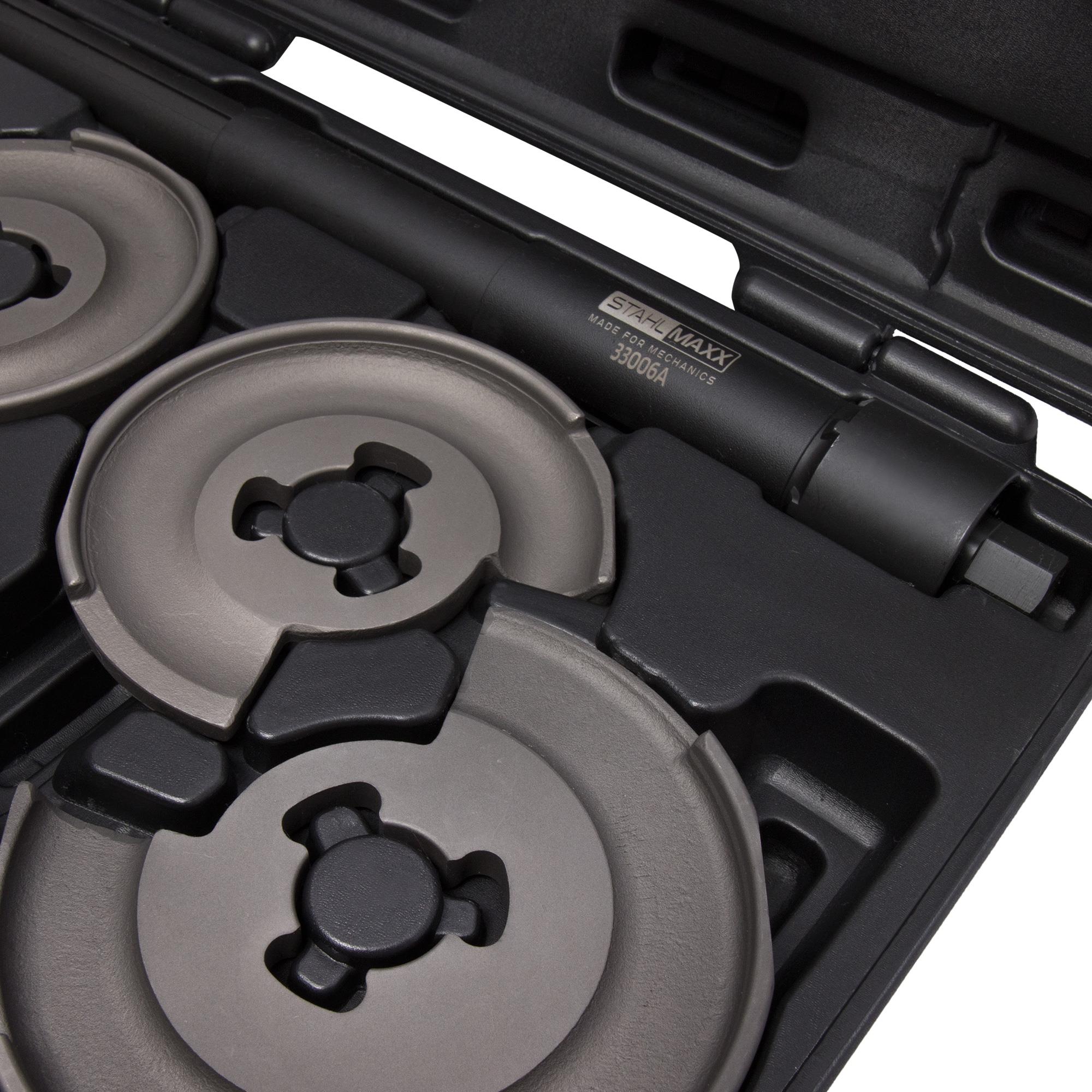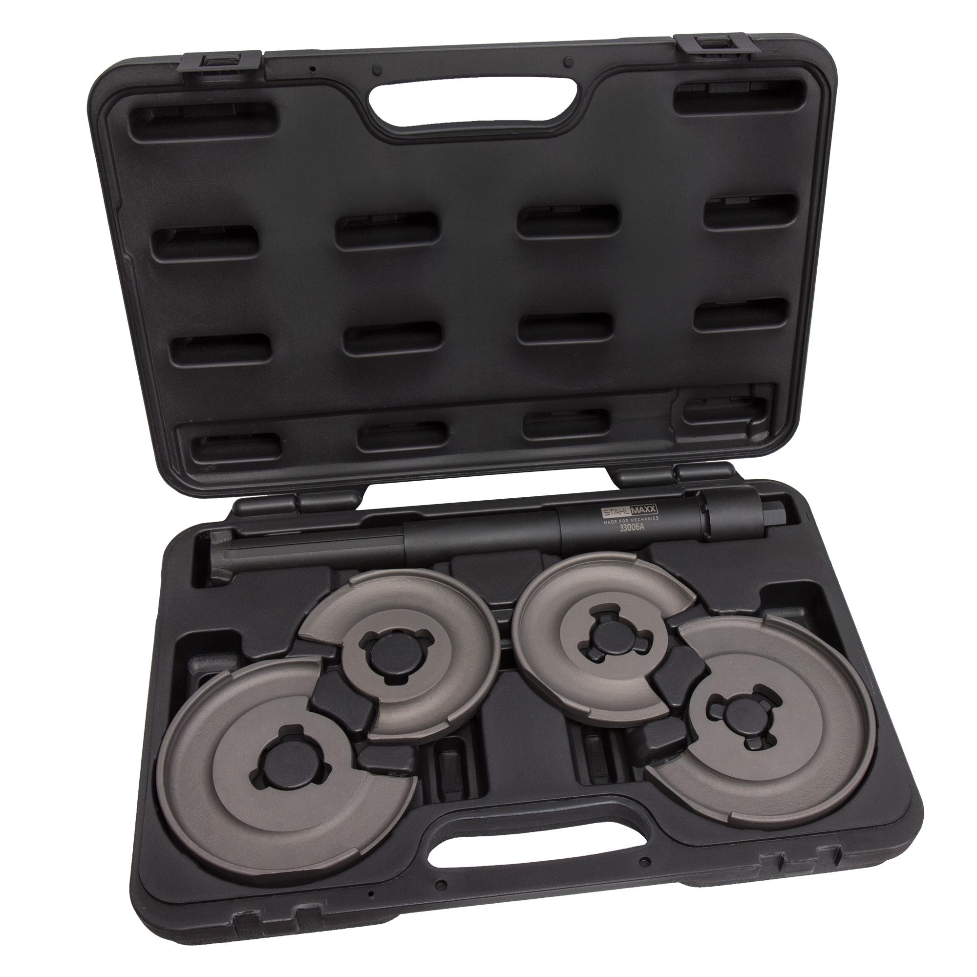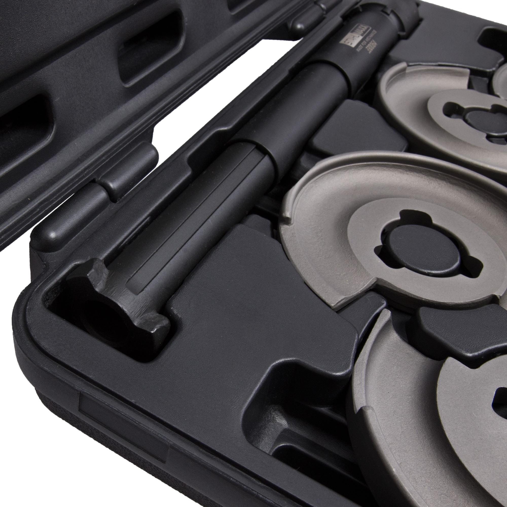 Dieser Profi-Federspanner ermöglicht ein einfaches, schnelles und sicheres Wechseln der Schraubenfedern bei Mercedes Tellersystemen sowie bei anderen Fahrzeugmarken mit einer Bohrung im Hinterachslenker ab 45 mm. Der Wechsel lässt sich mit diesem Werkzeug direkt am Fahrzeug durchführen, womit das teure und zeitaufwändige Zerlegen der Achse entfällt.