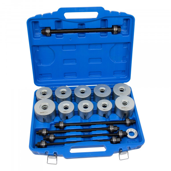 Spezialwerkzeugsatz, zur universellen De- und Montage von nahezu allen Lagern, Buchsen, Silent- und auch Radlagern, die eine gerade Auflagefläche besitzen und eine Durchgangsbohrung haben. Die Reparatur kann hierbei direkt am Fahrzeug, oder auch im ausgebauten Zustand erfolgen. Die gehärteten Druckhülsen sind ebenso für das Aus- und Einpressen auf der Hydraulikpresse geeignet.